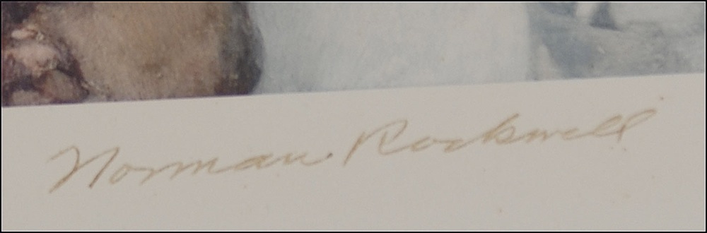 Color 27 x 33 print entitled 'Freedom from Want,' signed in the lower border in black felt tip. Reverse of print is stamped "This print has been autographed personally by Norman Rockwell. Available only at The Old Corner House, Stockbridge, Mass, 01262. List price $230.00." In fine condition, with Rockwell's signature a couple of shades light, but completely legible, a bit of mild edge toning, and small tape remnant along top edge of reverse. One of Rockwell's most recognizable works. Pre-certified PSA/DNA and RRAuction COA.