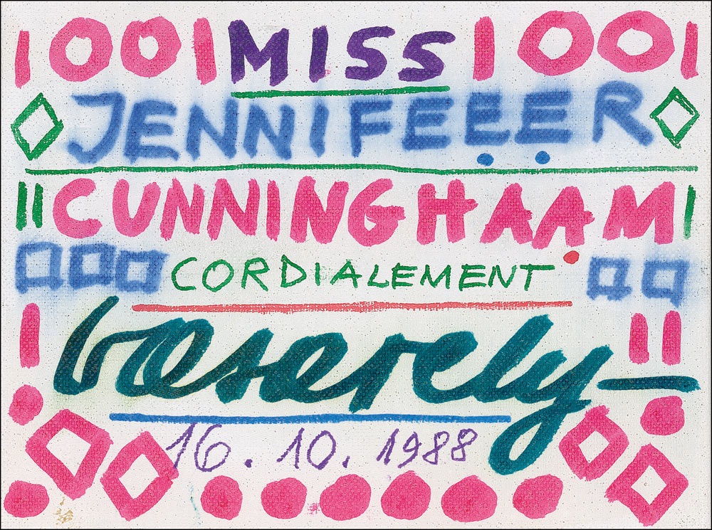 Pioneering Hungarian-born French artist (1906–1997) generally regarded as the founder of the Op Art movement that peaked during the Psychedelic Sixties. An original vibrantly colorful acrylic paint artwork by Vasarely on an 8 x 6 canvas panel. Vasarely has incorporated a signature and inscription into the work, which reads, "Miss Jennifeeer Cuningham, Cordialement, Vasarely, 16.10.1988." Vasarely has highlighted the edges with various lines and shapes. In fine condition, with some light bleeding to the blue paint. Originally done as a gift, Vasarely almost never did any type of artwork in response to requests, especially one as detailed and colorful as offered here. RRAuction COA.
