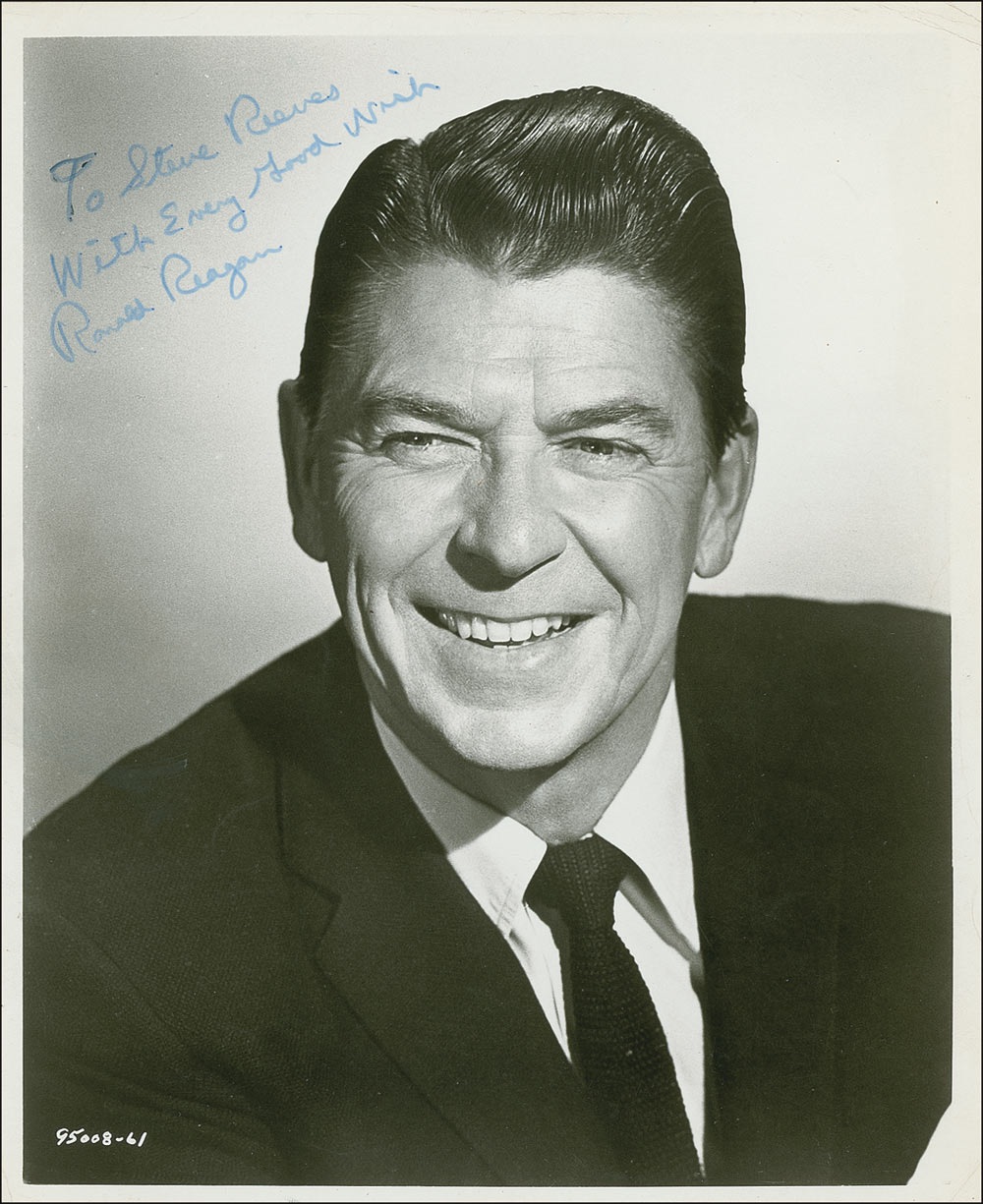 Vintage glossy 7.75 x 9.5 photo of Reagan in a suit and tie, signed and inscribed in blue felt tip “To Steve Reeves, with every good wish. Ronald Reagan.” In very good condition with creasing, light bends, surface impressions, and lightly trimmed edges. Reeves gained a cult following for his portrayal of the Greek hero Hercules in the late 1950s and into the 1960s. Pre-certified PSA/DNA and RRAuction COA.