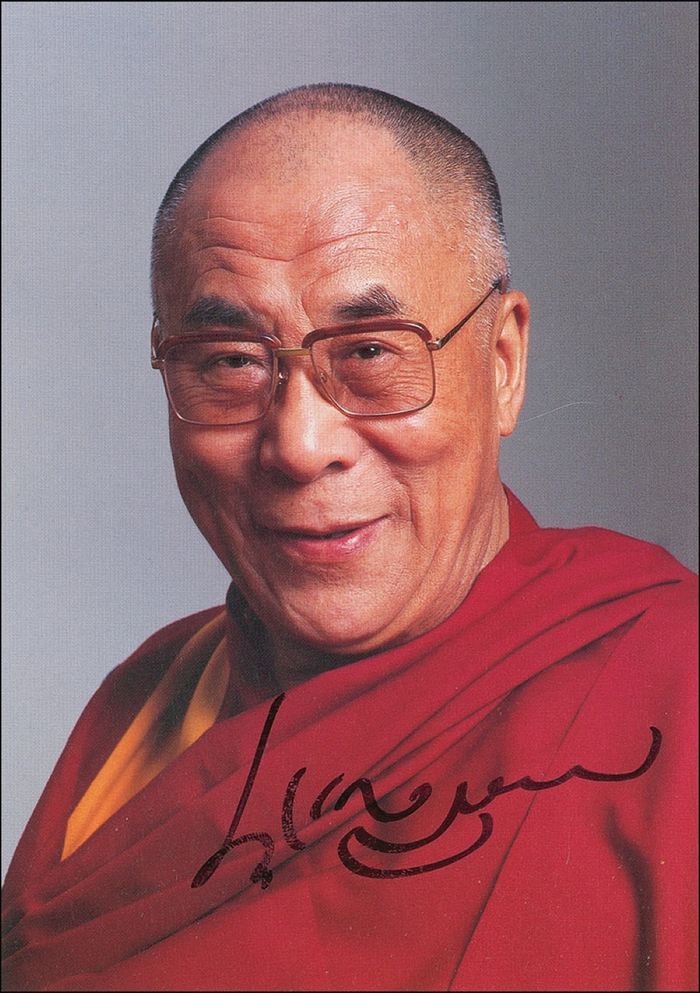 Color 4.75 x 6.5 cardstock photo of the smiling spiritual leader, signed in black felt tip. In fine condition, with a few light creases and dings to top left of background. RRAuction COA.