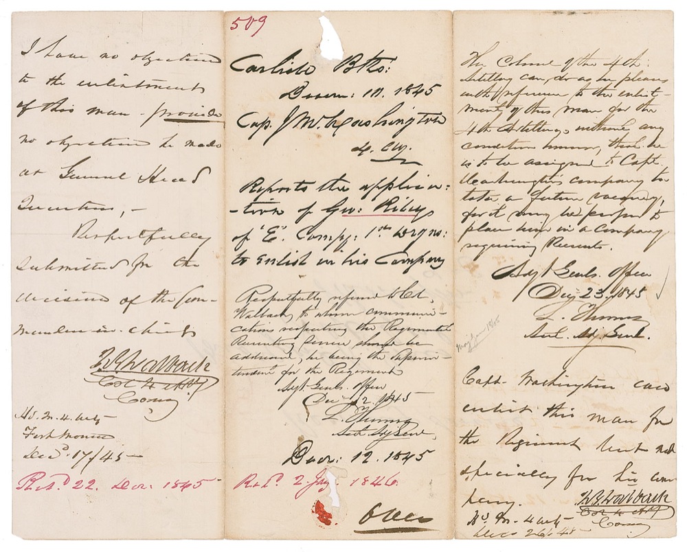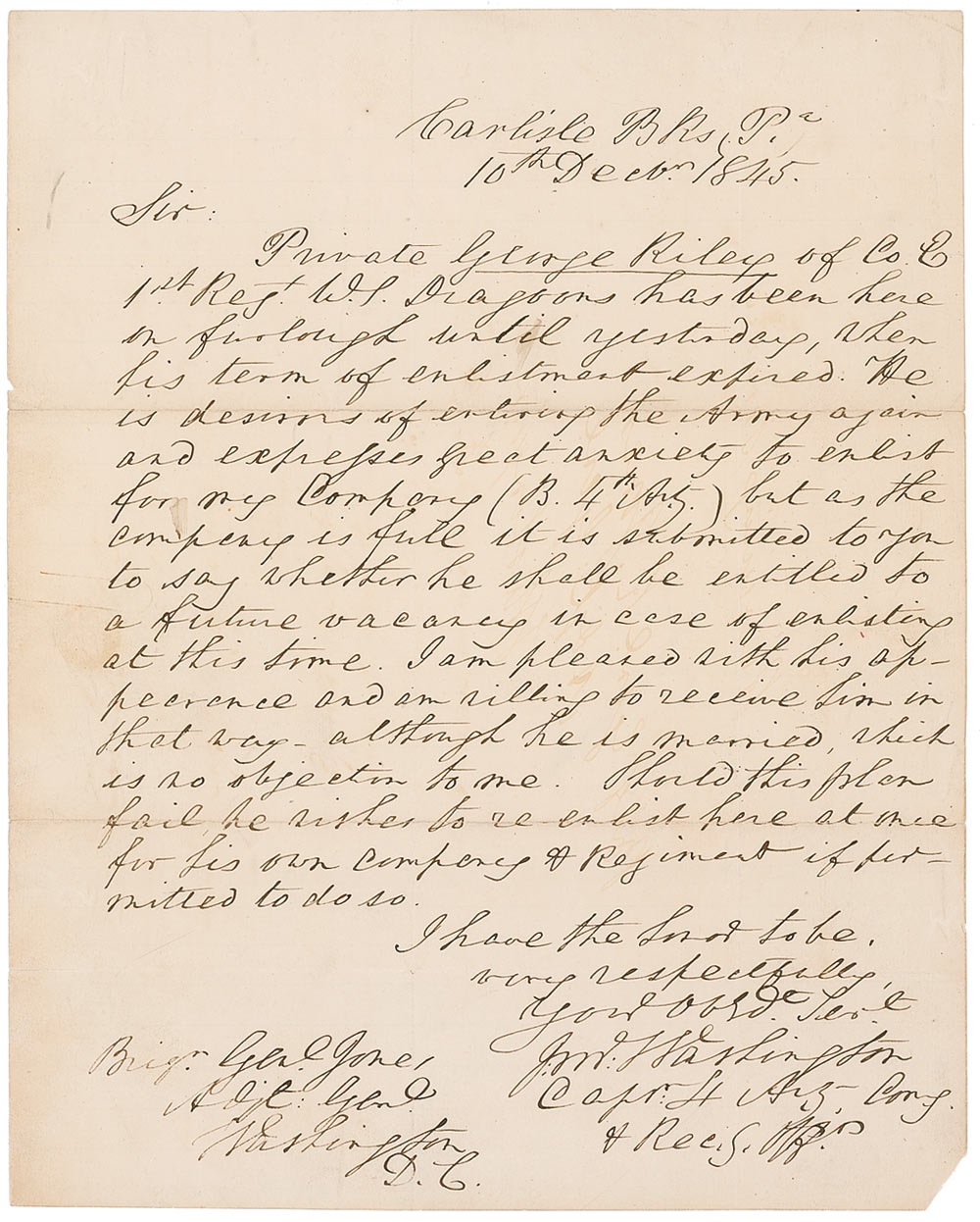 Thomas served in campaigns against the Florida Seminoles and was chief of staff to Winfield Scott in the Mexican War. He was adjutant general with rank of brigadier general in the Union army but Stanton banished him from Washington in 1863 to organize colored regiments. Two endorsements, signed “L. Thomas Act. Adj. Genl,” on the reverse of an address leaf to “Brig. Genl. R. Jones,” 10 x 8, one dated December 12, 1845, regarding the “Regimental Recruiting Service,” the second on the next panel, dated December 23, 1845, reads, in part: “The Colonel of the 4th Artillery can do as he pleases with reference to the enlistment of this man…he is to be assigned to Capt. Washington’s company.” In very good condition, with partial separations along vertical folds, scattered toning, a couple areas of paper loss from removal of seal, and a couple small notations. Accompanied by a December 10, 1845, ALS from Captain Washington to General Jones. RRAuction COA.