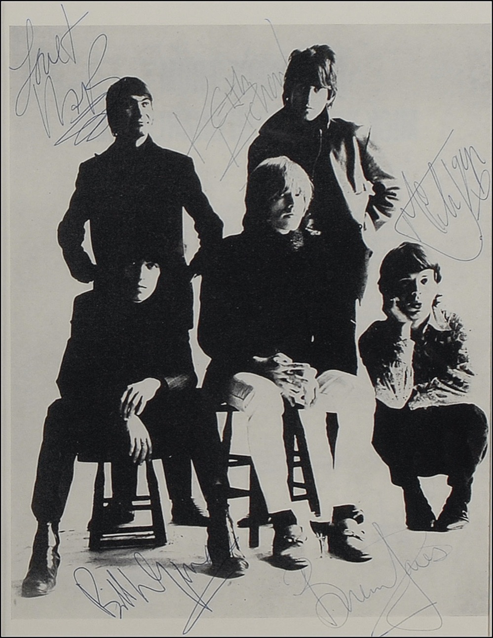 Vintage 8 x 10 tourbook photo of the band, likely late 1966 or early 1967, signed in blue ballpoint by Mick Jagger, Keith Richards, Brian Jones, Bill Wyman, and Charlie Watts. Matted and framed with a color lenticular image of the band from their their Satanic Majesty’s Request album, to an overall size of 24.75 x 16. In fine condition. Difficult to find in vintage photos signed by all five, especially given the approximate date of the photo, Stones fans last chance to see Brian Jones, the founder of the band, perform. Oversized. Pre-certified Roger Epperson/REAL and RRAuction COA.