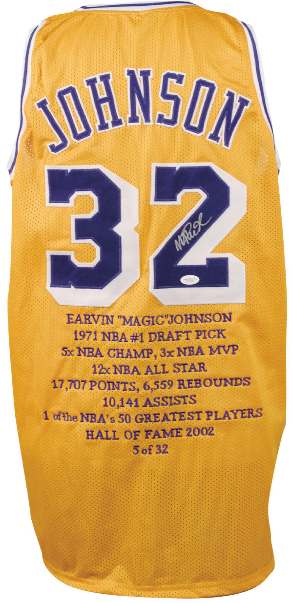 Replica Los Angeles Lakers basketball jersey, with sewn on letters and numbers, as well as Johnson’s career highlights embroidered on the reverse, signed in silver ink on the number on the back. Accompanied by a certificate of authenticity from James Spence. Pre-certified Steve Grad/PSA/DNA and RRAuction COA.
