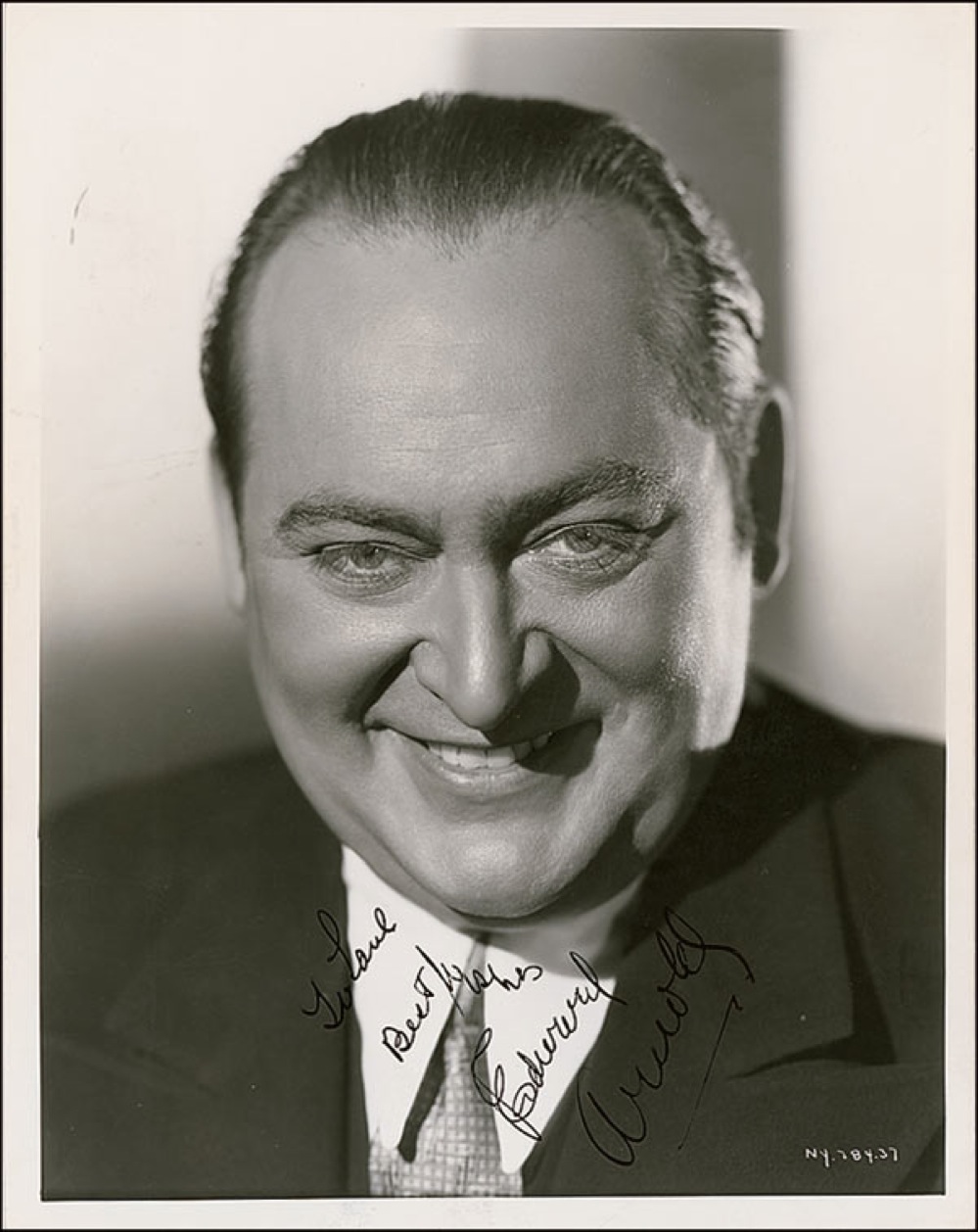 Actor (1890–1956), who although labeled as ‘box office poison’ never lacked for work. Vintage glossy 8 x 10 head-and-shoulders photo, credited to Robert W. Coburn, signed and inscribed in-person in fountain pen “To Saul, Best wishes, Edward Arnold.” Reverse of photo bears collector’s stamp date of June 18, 1935, the date the signature was acquired, as well as an affixed promotional caption for his upcoming role in Wednesday’s Child. In fine condition, with a few scattered light creases. Pre-certified PSA/DNA and RRAuction COA.