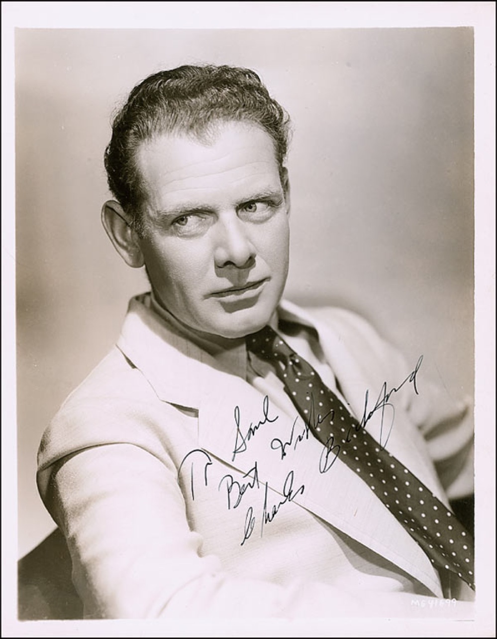 Actor (1891–1967) who was nominated three times for Best Supporting Actor. Vintage glossy 8 x 10 photo, signed and inscribed in-person in fountain pen “To Saul, Best wishes, Charles Bickford.” Reverse of photo bears collector’s stamp date of January 22, 1938, the date the signature was acquired. A few scattered light creases and surface marks, with a mild semi-circular crease lightly affecting signature, and a trivial surface chip to right edge, otherwise fine condition. Pre-certified PSA/DNA and RRAuction COA.