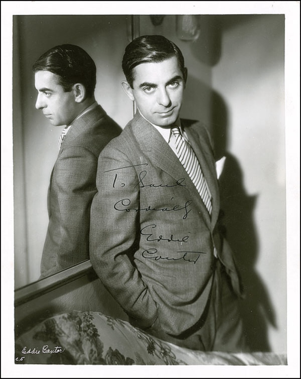 Vintage glossy 8 x 10 photo of Cantor in a three-piece suit with his hands in his pockets, signed and inscribed in-person in fountain pen “To Saul, cordially, Eddie Cantor.” Reverse of photo bears collector’s stamp date of February 1, 1935, the date the signature was acquired. In fine condition, with a few light surface creases to background and edges and some mild vertical edge curling. Pre-certified PSA/DNA and RRAuction COA.