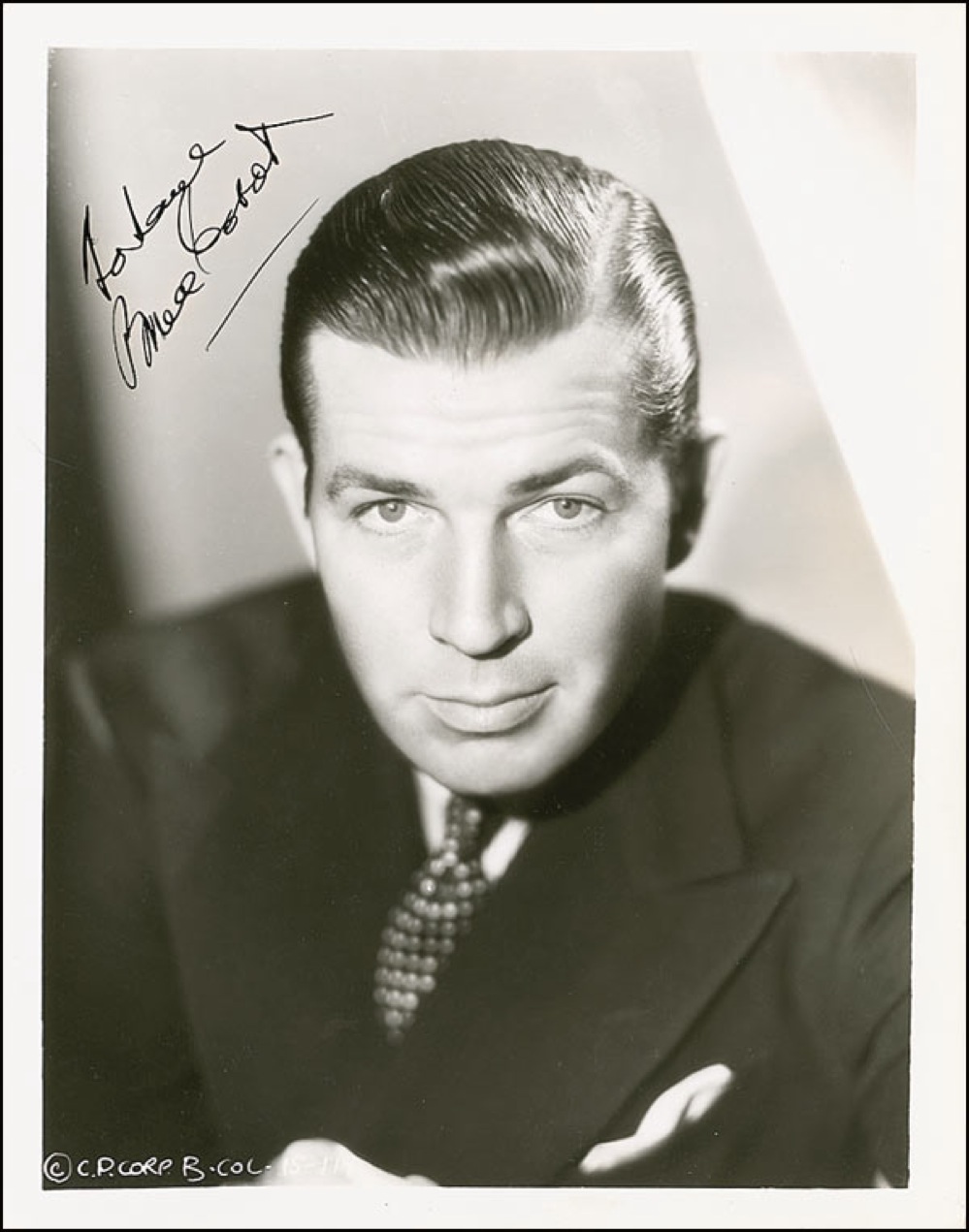 Actor (1904–1972) best remembered as Fay Wray’s savior in 1933’s King Kong, Cabot was a drinking buddy of John Wayne’s and spent the latter part of his career working almost exclusively in the Duke’s starring vehicles. Vintage glossy 8 x 10 head-and-shoulders photo, signed and inscribed in-person in fountain pen “To Saul, Bruce Cabot.” Reverse of photo bears collector’s stamp date of March 4, 1939, the date the signature was acquired. In fine condition, with a couple trivial corner tip dings. Pre-certified PSA/DNA and RRAuction COA.