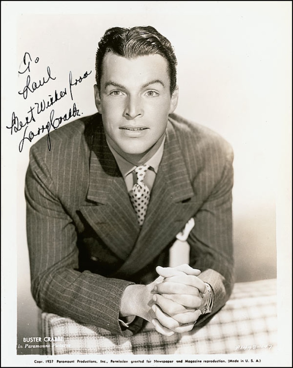 Athlete and actor (1908–1983) who starred in a number of serials, most notably as Flash Gordon. Dashing vintage glossy 8 x 10 Paramount 1937 publicity photo of Crabbe leaning over a chair, signed and inscribed in-person in fountain pen “To Saul, Best wishes from Larry Crabbe.” Reverse of photo bears collector’s stamp date of March 29, 1938, the date the signature was acquired. In fine condition, with a couple trivial surface marks and a couple light creases to left edge. Pre-certified PSA/DNA and RRAuction COA.