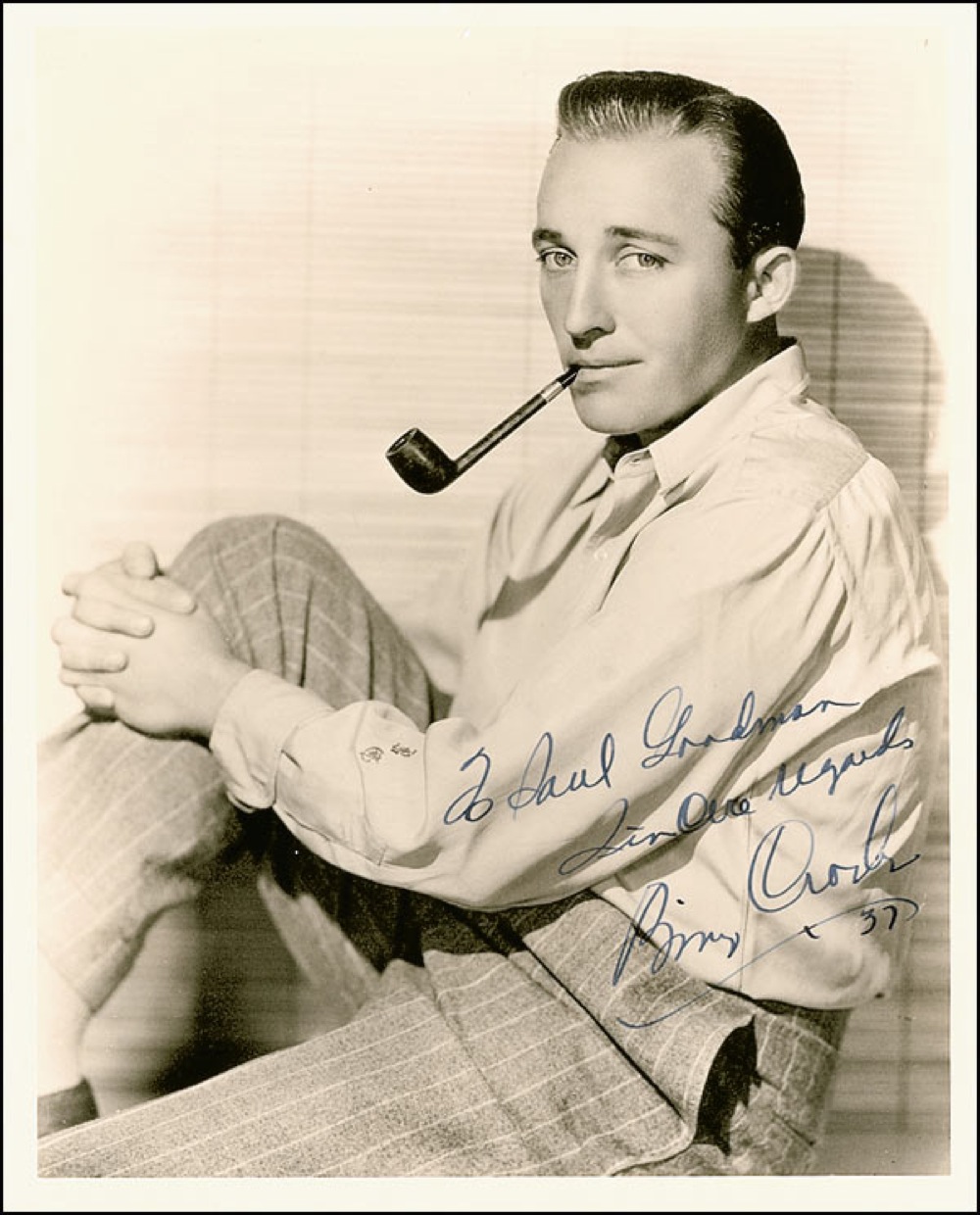 Beloved actor and singer (1903–1977) who won the Academy Award for Best Actor in the 1944 film Going My Way. Very nice vintage matte-finish 8 x 10 photo of Crosby relaxing with his pipe, signed and inscribed in-person in fountain pen “To Saul Goodman, Sincere regards, Bing Crosby ’37.” Reverse of photo bears collector’s stamp date of May 11, 1937, the date the signature was acquired. In fine condition, with small surface tear and ding to top border. Pre-certified PSA/DNA and RRAuction COA.