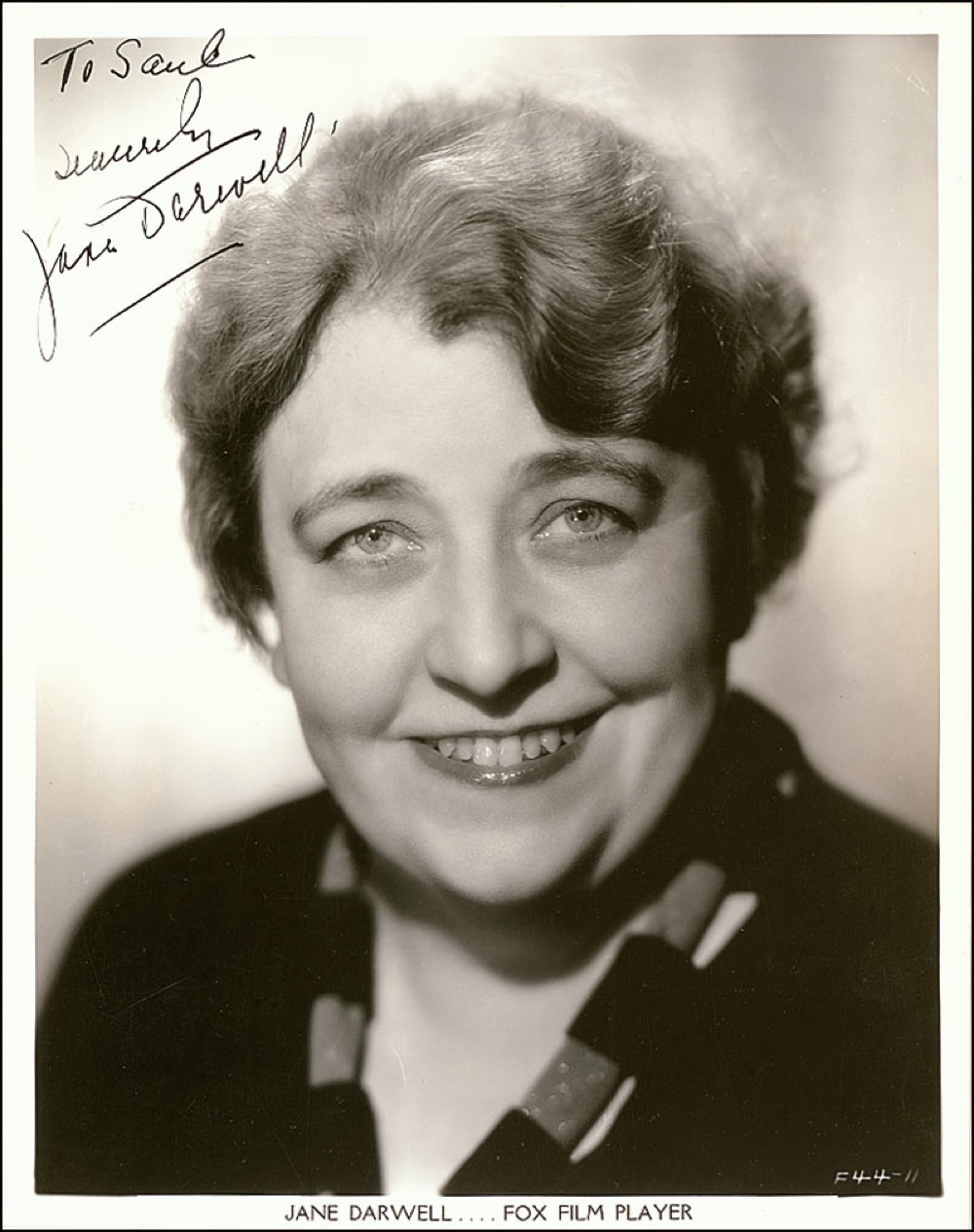 Durable American character actress (1879–1967) who won the Academy Award for her supporting role as Ma Joad in the 1940 classic The Grapes of Wrath. Scarce vintage glossy 8 x 10 Fox publicity head-and-shoulders photo, credited to Otto Dyar, signed and inscribed in-person in fountain pen “To Saul, Sincerely, Jane Darwell.” Reverse of photo bears collector’s stamp date of January 22, 1940, the date the signature was acquired. In fine condition, with a couple scattered mild surface marks and creases, not at all detracting from overall appearance. Pre-certified PSA/DNA and RRAuction COA.