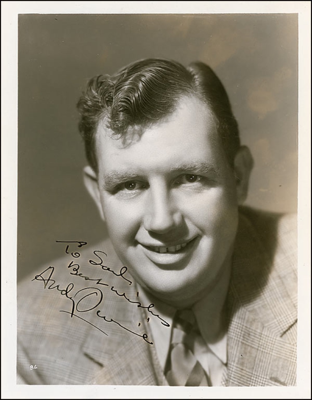 Vintage glossy 8 x 10 Universal publicity photo, credited to Ray Jones, of Devine smiling pleasantly in a jacket and tie, signed and inscribed in-person in fountain pen “To Saul, Best wishes, Andy Devine.” Reverse of photo bears collector’s stamp date of July 5, 1939, the date the signature was acquired. In fine condition, with some light haloing around signature and inscription, a few spots to background, and a crease to top edge. Pre-certified PSA/DNA and RRAuction COA.