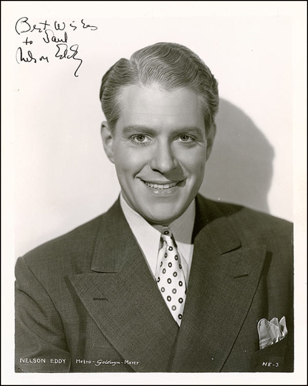 Actor and singer (1901–1967) who appeared in 19 musicals during the 1930s and 40s. He was one of the first ‘crossover’ stars appealing to both young and old, and in his heyday was the highest paid singer in the world. Handsome vintage pearl-finish 8 x 10 double weight photo of Eddy smartly dressed in a three-piece suit, signed and inscribed in-person in fountain pen “Best wishes to Saul, Nelson Eddy.” Reverse of photo bears collector’s stamp date of March 17, 1935, the date the signature was acquired. In fine condition, with a couple light edge creases. Pre-certified PSA/DNA and RRAuction COA.