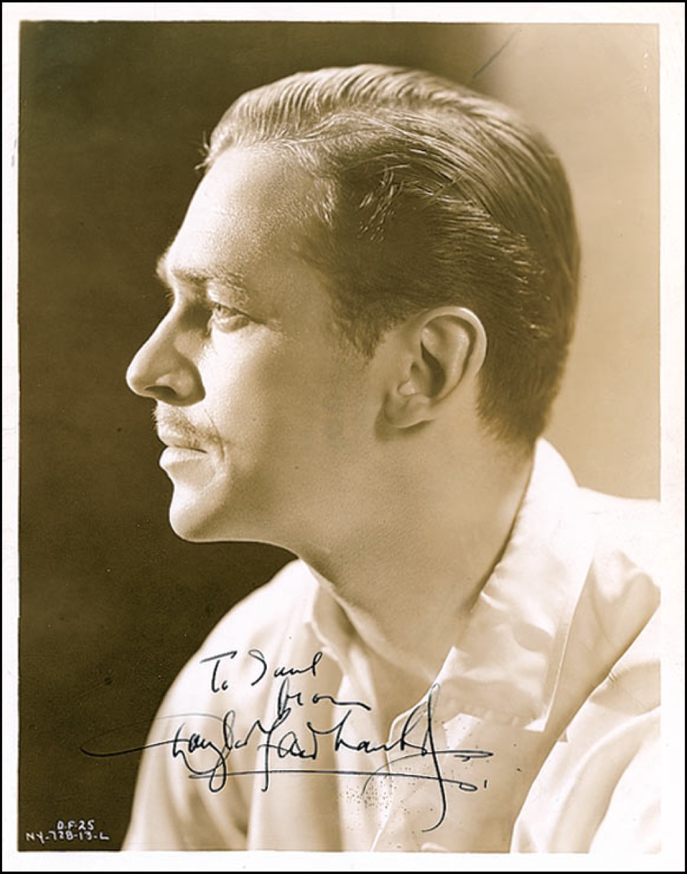 Handsome vintage sepia glossy 8 x 10 head-and-shoulders photo of the actor in profile, signed and inscribed in-person in fountain pen “To Saul from Douglas Fairbanks, Jr.” Reverse of photo bears collector’s stamp date of February 5, 1936, the date the signature was acquired. In fine condition, with a few scattered light creases and surface marks, and some light rippling to emulsion. Pre-certified PSA/DNA and RRAuction COA.