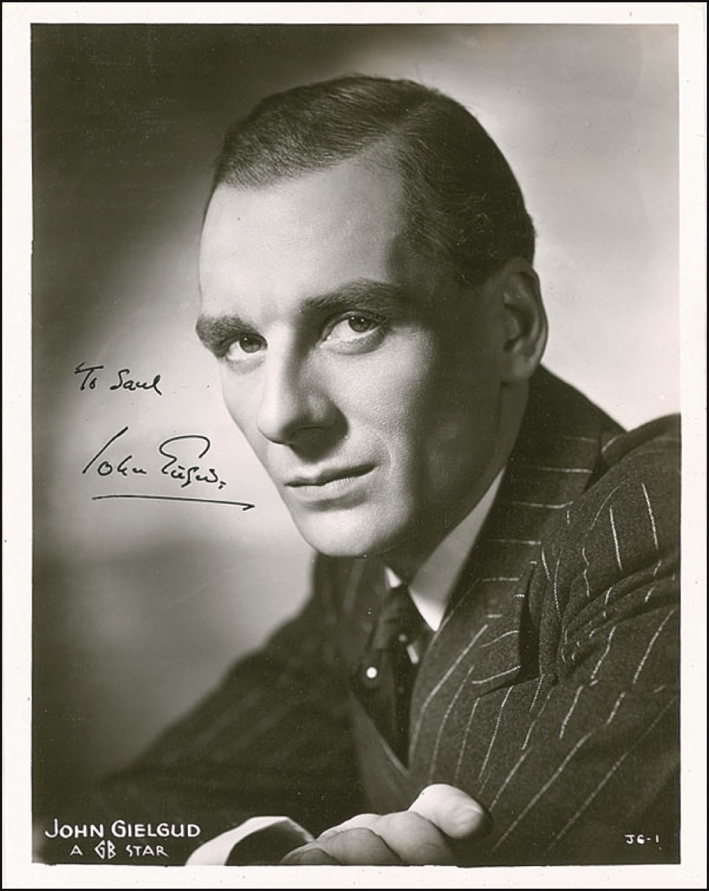 English actor, director, and producer (1904–2000) who is one of the few entertainers who have won an Oscar, Emmy, Grammy, and Tony Award. Early vintage glossy 8 x 10 GB publicity photo of the actor in a pin-stripe suit, signed and inscribed in fountain pen “To Saul, John Gielgud.” Reverse of photo bears collector’s stamp date of November 25, 1936, the date the signature was acquired. In fine condition, with a few minor surface creases, and a few light vertical streaks to emulsion. Pre-certified PSA/DNA and RRAuction COA.