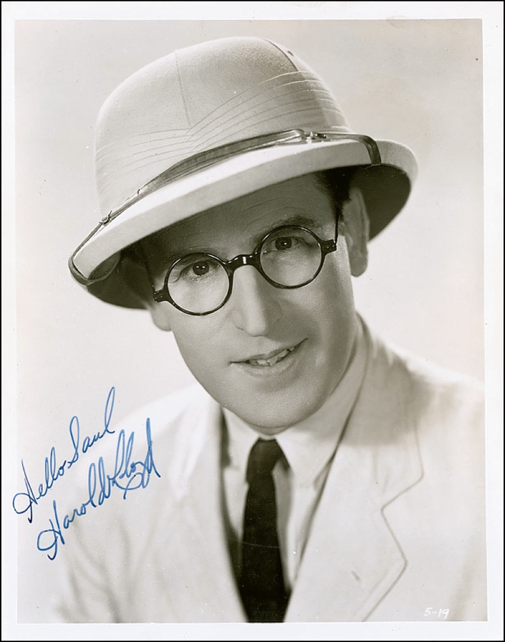 Popular comic actor and director of the silent era (1893–1971), known for his trademark round eyeglasses. Charming vintage glossy 8 x 10 photo of Lloyd in a suit and pith helmet, signed and inscribed in-person in fountain pen “Hello Saul, Harold Lloyd.” Reverse of photo bears collector’s ink date of September 1934, the date the signature was acquired. In fine condition, with a mild semi-circular surface impression to lower portion of image. Pre-certified PSA/DNA and RRAuction COA.