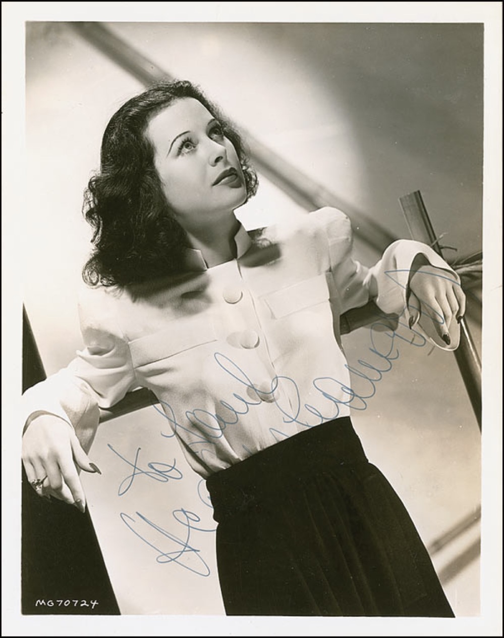 Lovely vintage glossy 8 x 10 photo of Lamarr leaning against a fence, signed and inscribed in-person in fountain pen “To Saul, Hedy Lamarr.” Reverse of photo bears collector’s stamp date of January 27, 1940, the date the signature was acquired. In fine condition, with a few scattered light surface marks, and a hint of trivial silvering. Pre-certified PSA/DNA and RRAuction COA.