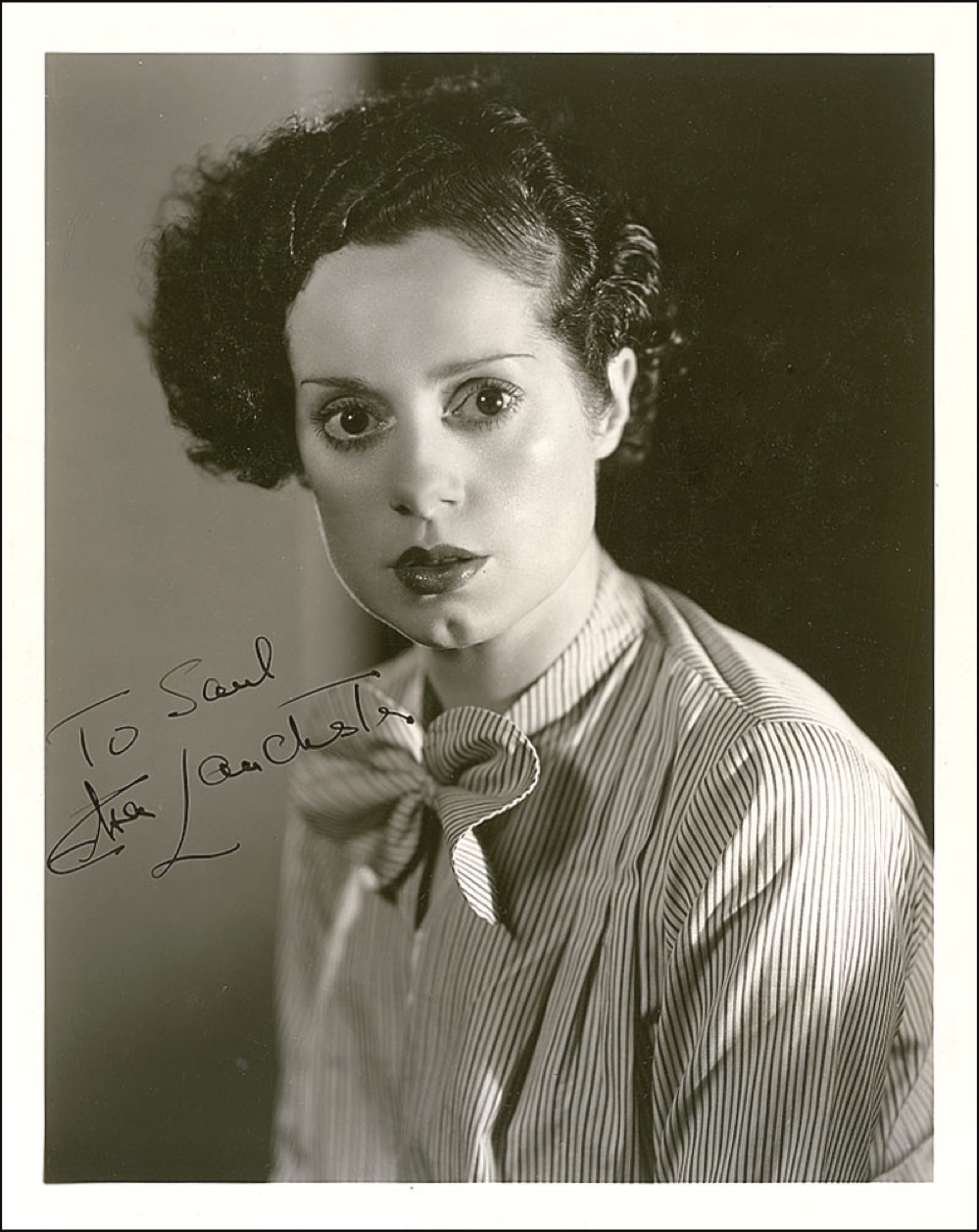 Actress (1902–1986) most famous for her role as The Bride of Frankenstein. Vintage pearl-finish 8 x 10 double weight Clarence Sinclair Bull MGM publicity photo, signed and inscribed in-person in fountain pen “To Saul, Elsa Lanchester.” Reverse of photo bears collector’s stamp date of January 5, 1939, the date the signature was acquired. Promotional caption affixed to reverse reads, in part: “Elsa Lanchester…is now under contract with Metro-Goldwyn-Mayer Studios to make one picture, title of which, is still indefinite.” In fine condition, with a few scattered light surface marks and a light ripple from caption affixed to reverse. Pre-certified PSA/DNA and RRAuction COA.
