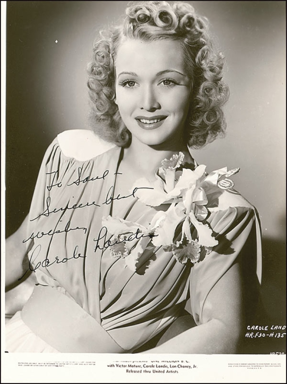 Buxom Hollywood starlet (1919–1948) who committed suicide at the age of 29; by some accounts, her unrequited love for Rex Harrison was the source of her despair. Vintage glossy 7.25 x 9.75 Hal Roach promotional photo for One Million B.C., signed and inscribed in-person in fountain pen “To Saul – Sincere best wishes, Carole Landis.” Reverse of photo bears collector’s stamp date of September 23, 1941, the date the signature was acquired. In fine condition, with a lightly trimmed edge. Pre-certified PSA/DNA and RRAuction COA.