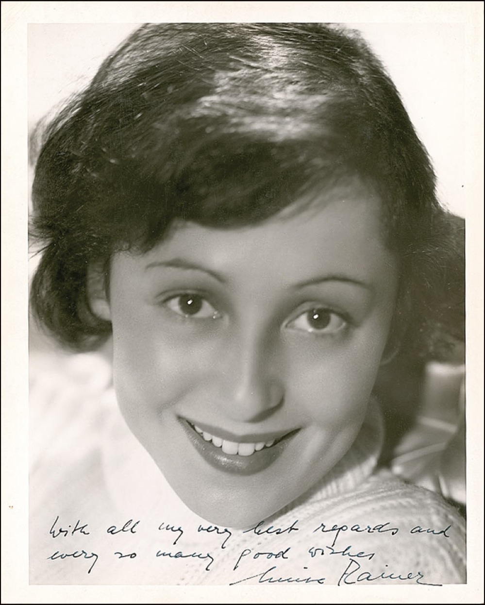 German actress (born in 1910) was the first woman to win two Academy Awards, and the first person to win them consecutively for The Great Ziegfeld and The Good Earth. Vintage pearl-finish 8 x 10 double weight Hurrell MGM publicity photo of Rainier for her upcoming role in The Good Earth, signed in-person in fountain pen. Reverse of photo bears collector’s date notation of August 19, 1950, the date the signature was acquired. Promotional caption affixed to reverse reads, in part: “Luise Rainer…who is portraying O-Lan opposite Paul Muni in Irving G. Thalberg’s ‘The Good Earth.’” In fine condition, with a few light corner tip creases, a bit of light border soiling, and light surface rubbing. Pre-certified PSA/DNA and RRAuction COA.