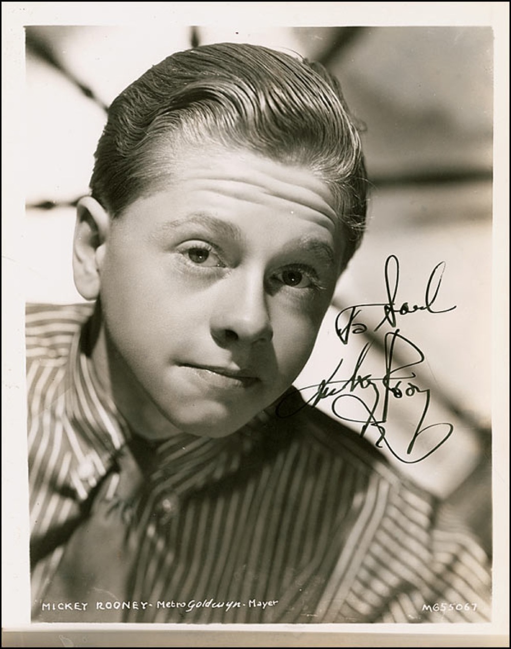 Vintage glossy 8 x 10 MGM publicity photo of Rooney from early in his career, signed and inscribed in-person in fountain pen “To Saul, Mickey Rooney.” Reverse of photo bears collector’s stamp date of February 12, 1939, the date the signature was acquired. In fine condition, with some scattered light creases and surface dings. Pre-certified PSA/DNA and RRAuction COA.