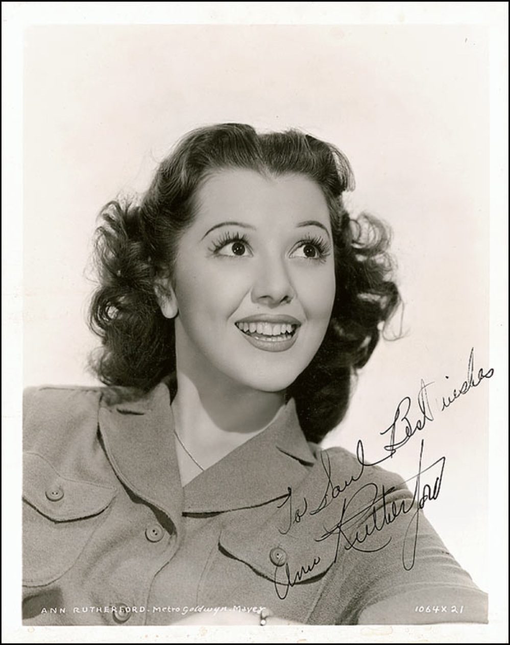 Vintage glossy 8 x 10 MGM publicity photo of Rutherford, signed and inscribed in-person in fountain pen “To Saul, Best wishes, Ann Rutherford.” Reverse of photo bears collector’s stamp date of November 2, 1939, the date the signature was acquired. Some light staining to bottom border, a couple very small edge tears, and a bit of mild silvering, otherwise fine condition. Pre-certified PSA/DNA and RRAuction COA.