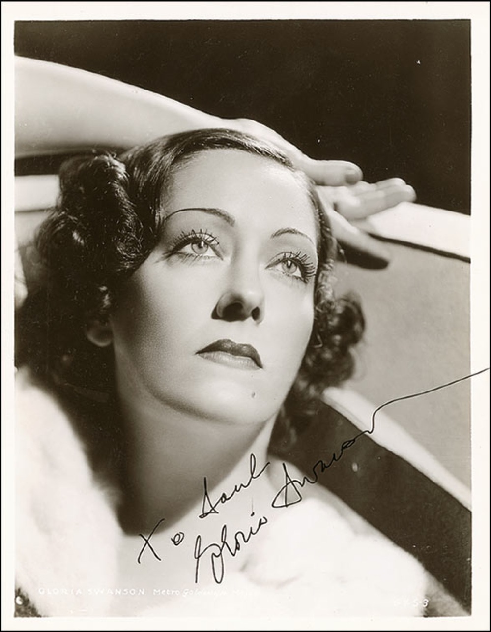 One of the biggest stars of the silent area (1899–1983). Vintage glossy 8 x 10 MGM publicity photo of Swanson with her arm behind her head, signed and inscribed in-person in fountain pen “To Saul, Gloria Swanson.” Reverse of photo bears collector’s stamp date of December 10, 1936, the date the signature was acquired. In fine condition, with a light vertical streak to left side and scattered light surface marks and surface rubbing. Pre-certified PSA/DNA and RRAuction COA.