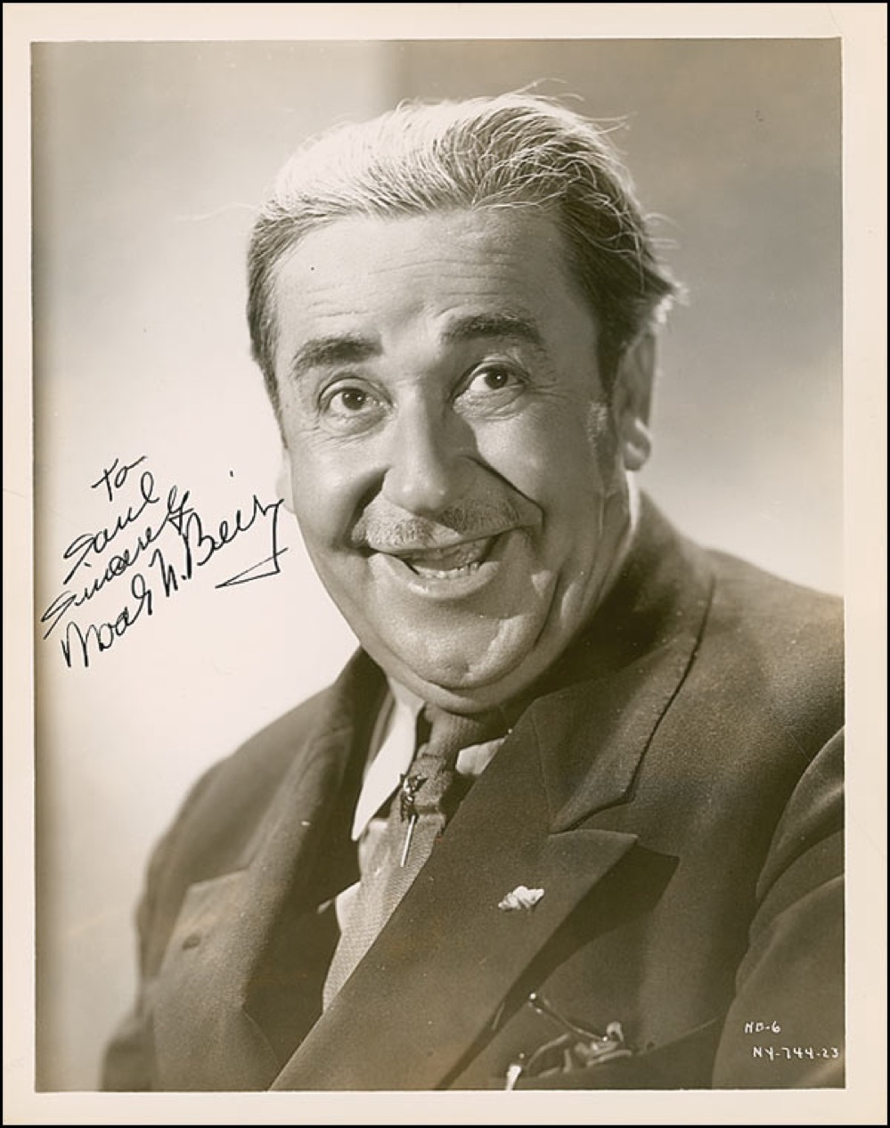 Actor (1882–1946) and brother of Wallace Beery. Vintage glossy 8 x 10 photo of Beery flashing an enthusiastic smile, signed and inscribed in-person in fountain pen “To Saul, Sincerely, Noah N. Beery.” Reverse of photo bears collector’s stamp date of March 28, 1935, the date the signature was acquired. In fine condition, with a couple trivial dings and surface creases, and a miniscule tear to top edge. Pre-certified PSA/DNA and RRAuction COA.