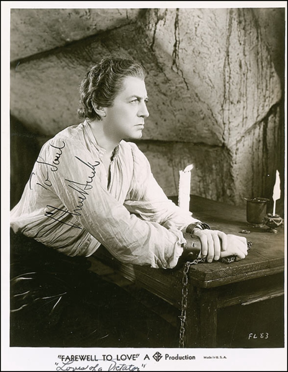 British actor (1887–1974) who played opposite Marlene Dietrich in Shanghai Express. He also played Sherlock Holmes three times. Vintage glossy 8 x 10 GB Pictures publicity photo for Farewell to Love, corrected in the border in an unknown hand to Loves of a Dictator, showing Brook as Doctor Struensee, signed and inscribed in-person in fountain pen “To Saul, Clive Brook.” Reverse of photo bears collector’s stamp date of July 10, 1935, the date the signature was acquired. In fine condition. Pre-certified PSA/DNA and RRAuction COA.