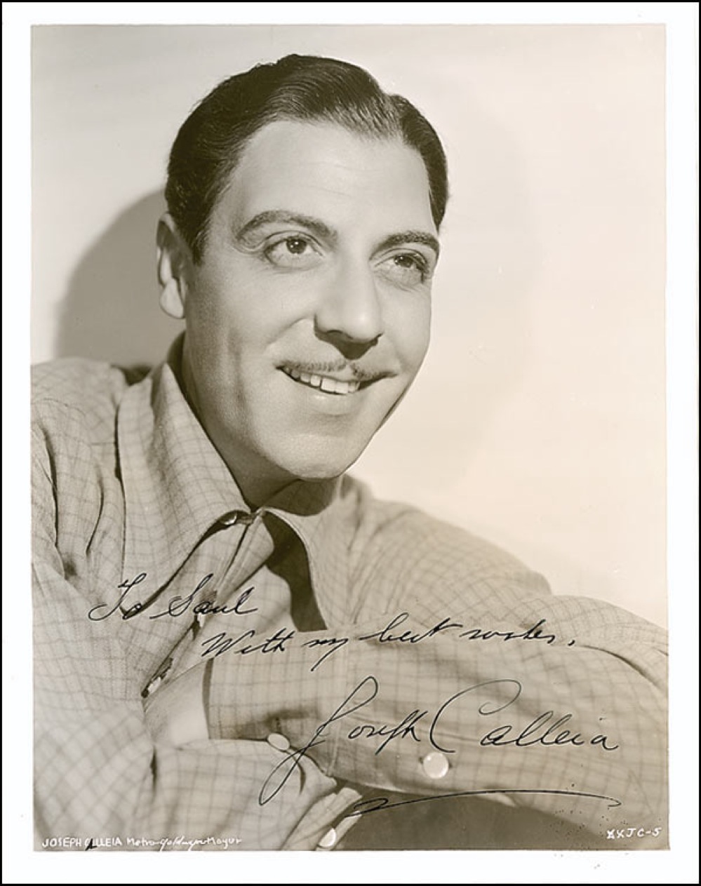 Menacing character player of Hollywood films (1897–1975), often in darkly mysterious roles. Vintage glossy 8 x 10 photo, signed and inscribed in-person in fountain pen “To Saul, With my best wishes, Joseph Calleia.” Reverse of photo bears collector’s stamp date of January 31, 1936, the date the signature was acquired. In fine condition, with a few scattered light surface marks and dings. Pre-certified PSA/DNA and RRAuction COA.