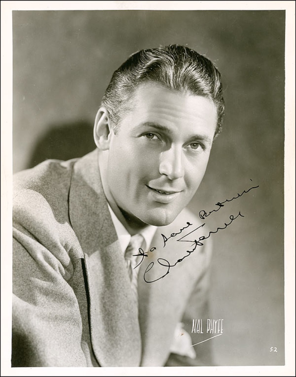 Silent star (1901–1990) who converted to ‘talkies’ and is best remembered for his on screen romances with actress Janet Gaynor in more than a dozen films. Vintage glossy 8 x 10 photo, signed and inscribed in-person in fountain pen. Reverse of photo bears collector’s stamp date of September 30, 1939, the date the signature was acquired. Reverse also bears a 1932 Roxy stamp and pencil notation in another hand reading, “Charles Farrell in ‘After Tomorrow.’” In fine condition, with scattered light creases, surface marks, and impressions from note on reverse, and some minor emulsion chipping to bottom edge. Pre-certified PSA/DNA and RRAuction COA.
