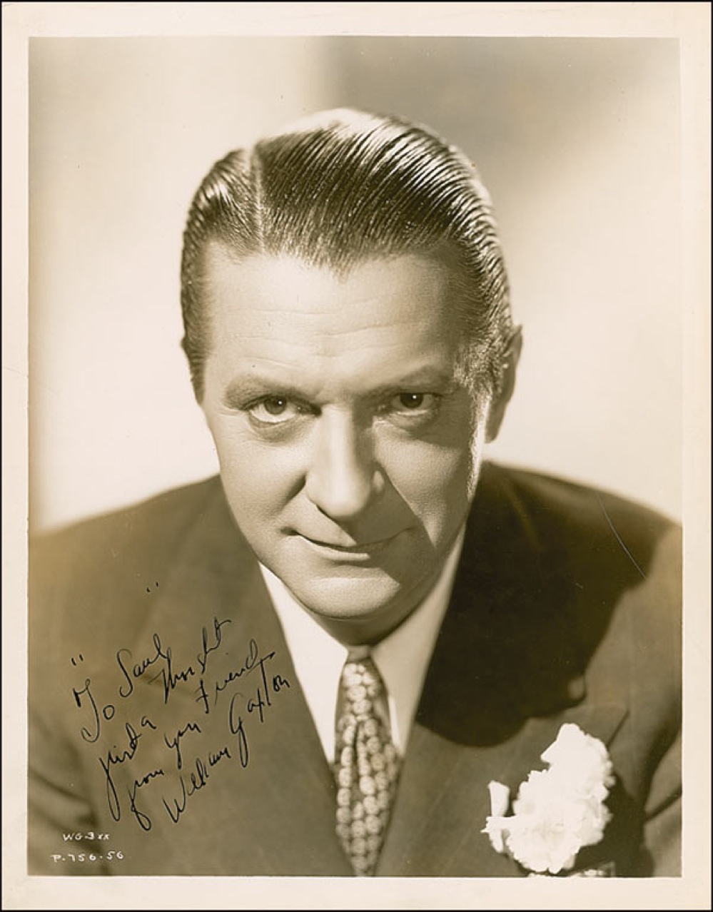 Vintage glossy 8 x 10 photo, signed and inscribed in-person in fountain pen “’To Saul’ just a thought from your friend William Gaxton.” Reverse of photo bears collector’s stamp date of May 30, 1935, the date the signature was acquired. In fine condition, with some scattered light creases and surface marks. Pre-certified PSA/DNA and RRAuction COA.