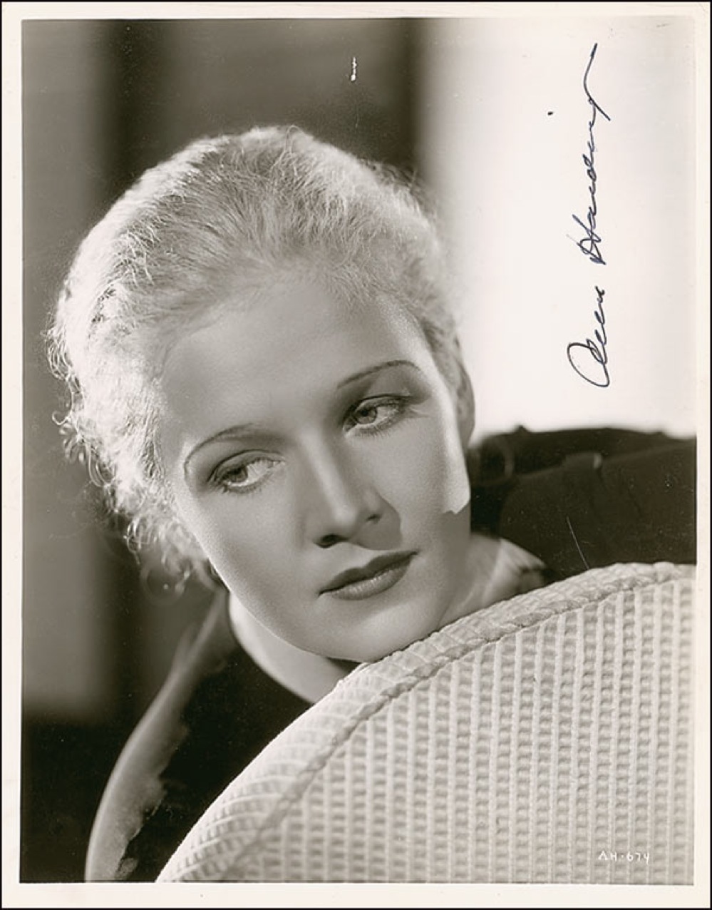 Vintage glossy 8 x 10 Radio Pictures publicity photo of Harding resting her chin on the top of a chair, credited to Bachrach, signed vertically in-person in fountain pen. In fine condition, with some light creasing to top edge and a couple of corners, and surface impressions to upper portion of background. Pre-certified PSA/DNA and RRAuction COA.