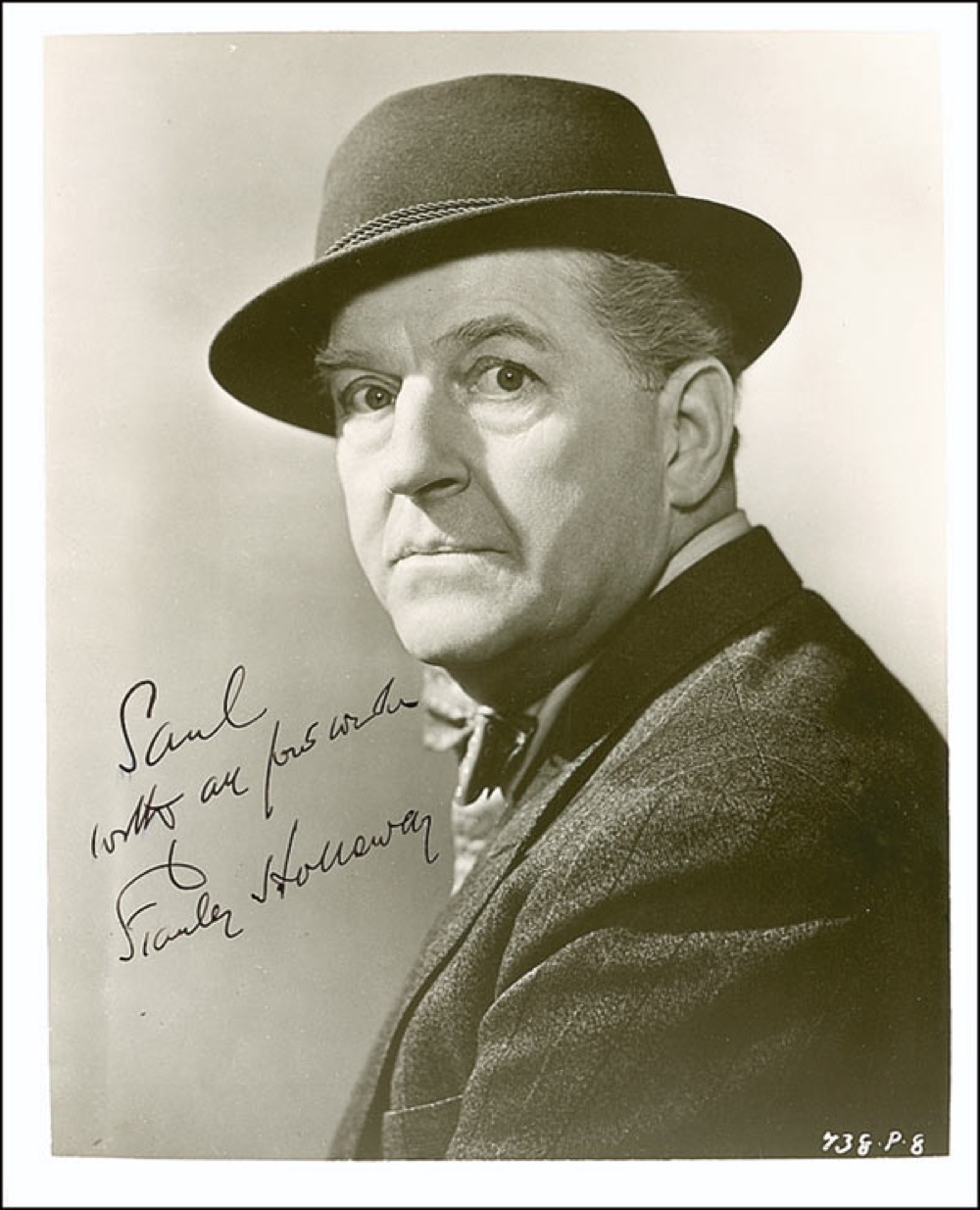 English actor (1890–1982) famous for his comic and character roles, especially that of Alfred P. Doolittle in My Fair Lady. Vintage glossy 8 x 10 photo of the actor in an overcoat and hat, signed and inscribed in-person in fountain pen “Saul, with all good wishes, Stanley Holloway.” Reverse of photo bears collector’s stamp date of October 6, 1954, the date the signature was acquired. In fine condition, with a few light creases and surface marks, and a trivial brush to inscription. Pre-certified PSA/DNA and RRAuction COA.