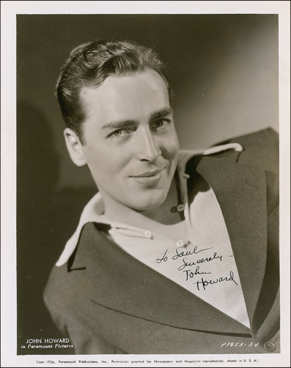 Handsome vintage glossy 8 x 10 Paramount Pictures 1936 publicity photo, signed and inscribed in-person in fountain pen “To Saul, Sincerely, John Howard.” Reverse of photo bears collector’s stamp date of July 9, 1940, the date the signature was acquired. Some scattered light surface marks and impressions, and a light vertical streak through a few letters of signature and inscription, otherwise fine condition. Pre-certified PSA/DNA and RRAuction COA.