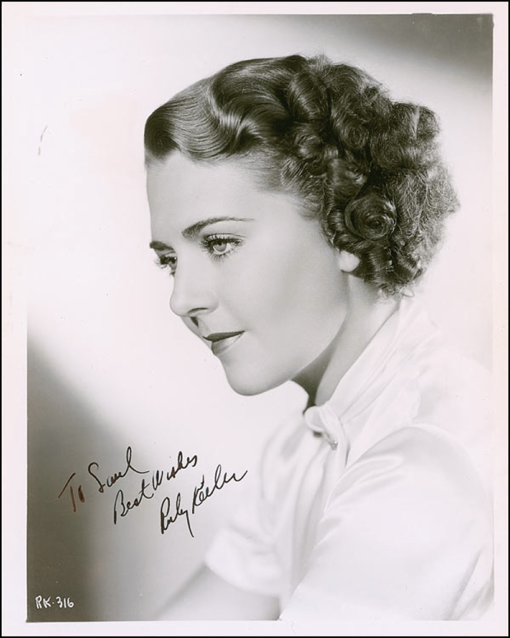 Attractive vintage glossy 8 x 10 photo, signed and inscribed in-person in fountain pen “To Saul, Best wishes, Ruby Keeler.” Reverse of photo bears collector’s ink date notation of May 24, 1950, the date the signature was acquired. In fine condition, with some scattered mild rippling to emulsion, some to facial area. Pre-certified PSA/DNA and RRAuction COA.