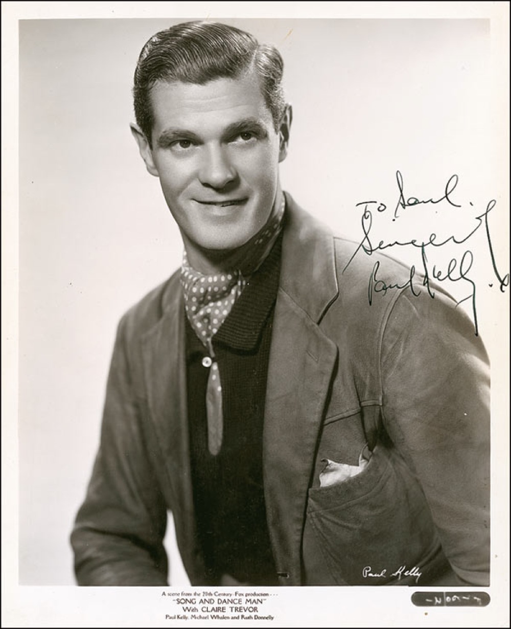 Vintage glossy 8 x 10 20th Century Fox promotional photo of Kelly as Hap Farrell from the film Song and Dance Man, signed and inscribed in-person in fountain pen “To Saul, Sincerely, Paul Kelly.”Reverse of photo bears collector’s ink date notation of November 17, 1945, the date the signature was acquired. In fine condition, with a few scattered light surface creases and a small tack hole to bottom edge. Pre-certified PSA/DNA and RRAuction COA.