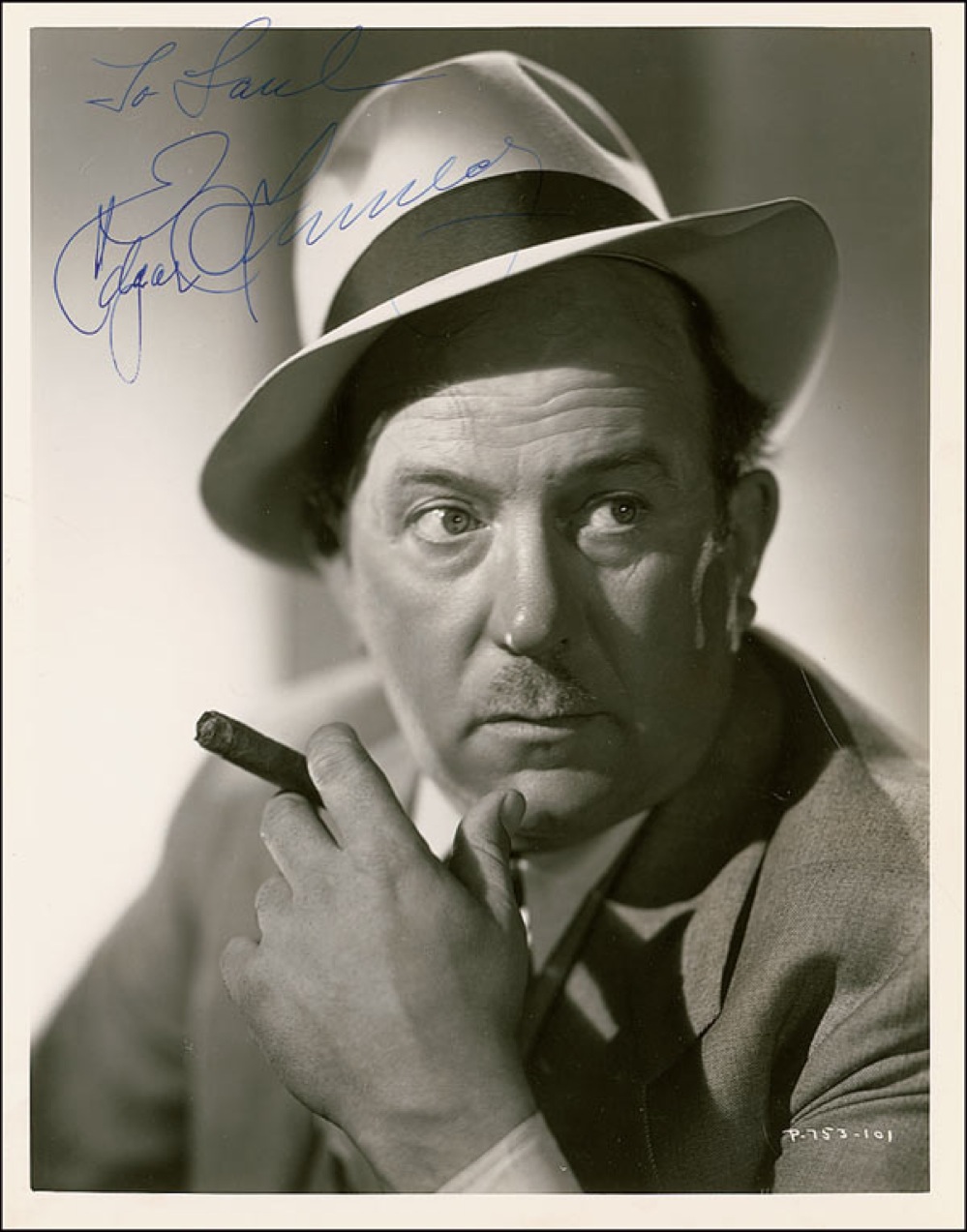 American comic actor (1890–1948) who appeared in films alongside such luminaries as the Marx Brothers, Charlie Chaplin, Laurel and Hardy, and Fatty Arbuckle. Vintage glossy 8 x 10 Radio Pictures publicity photo of the actor looking serious as he holds his cigar, credited to Bachrach, signed and inscribed in-person in fountain pen “To Saul, Edgar Kennedy.” Reverse of photo bears collector’s stamp date of June 16, 1936, the date the signature was acquired, as well as a promotional caption affixed to reverse. In fine condition, with a few light surface bends and impressions. Pre-certified PSA/DNA and RRAuction COA.