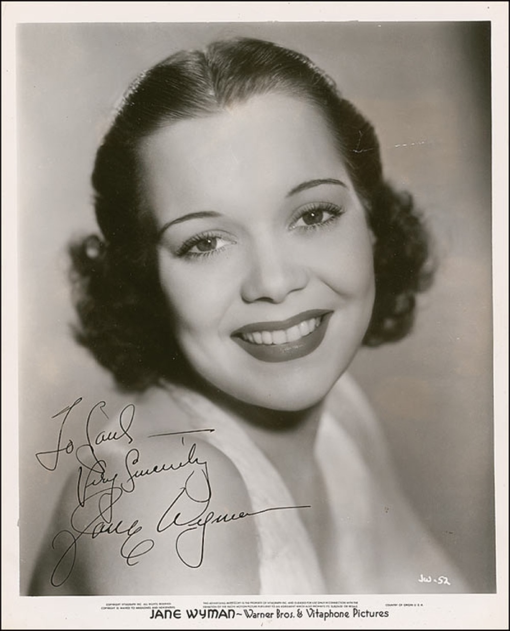 Singer, dancer, and character actress (1917–2007) who won an Academy Award for Best Actress for 1948’s Johnny Belinda. Vintage glossy 8 x 10 Warner Bros. and Vitaphone publicity photo, signed and inscribed in-person in fountain pen “To Saul – Very sincerely, Jane Wyman.” Reverse of photo bears collector’s stamp date of December 16, 1939, the date the signature was acquired. In very good condition, with a few spots of discoloration to background, and some noticeable creases to upper right. Pre-certified PSA/DNA and RRAuction COA.