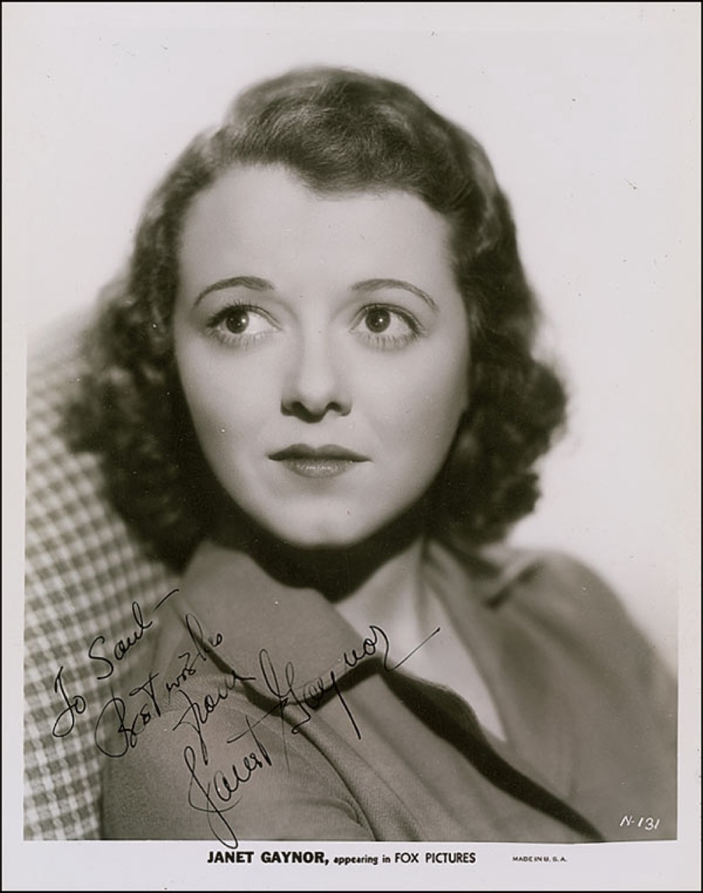 One of the most popular actresses of the silent film era (1906–1984), she became the first three-time Academy Award winner for Best Actress for Seventh Heaven (1927), Sunrise: A Song of Two Humans (1927) and Street Angel (1928). This was the only occasion on which an actress has won for multiple roles. This rule would be changed three years later. Vintage glossy 8 x 10 Fox Pictures publicity photo, signed and inscribed in-person in fountain pen “To Saul, Best wishes from Janet Gaynor.” Reverse of photo bears collector’s stamp date of January 24, 1935, the date the signature was acquired. In fine condition, with some scattered light surface marks and a bit of mild silvering. Pre-certified PSA/DNA and RRAuction COA.
