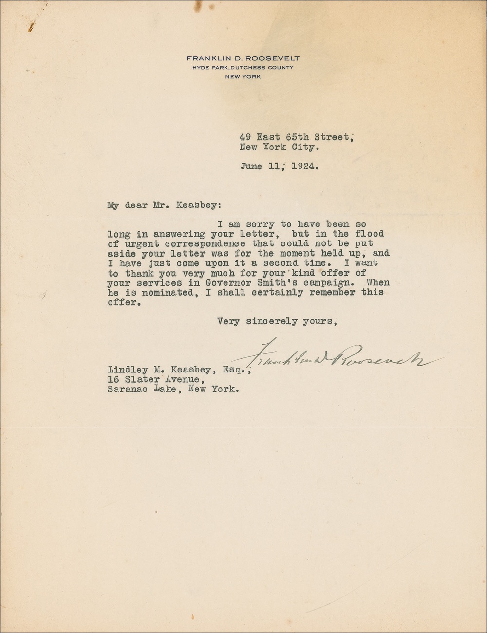 TLS, one page, 8.5 x 11, personal letterhead, June 11, 1924. Letter to Lindley M. Keasbey. In part: “I am sorry to have been so long in answering your letter, but in the flood of urgent correspondence that could not be put aside your letter was for the moment held up…I want to thank you for your kind offer of your service in Governor Smith’s campaign. When he is nominated, I shall certainly remember this offer.”Scattered mild toning, a bit of trivial foxing, and a rusty paperclip mark to top, otherwise fine condition. Keasbey taught at the University of Texas for many years and was made head of the Department of Institutional History after being removed from the Department of Government due to criticism that his political views were too radical. In 1917 he helped organize the People's Council of America, an organization that opposed the entry of the United States into World War I. The board of regents protested Professor Keasbey's political activities and fired him when he refused to defend his position before them. Pre-certified John Reznikoff/PSA/DNA and RRAuction COA.