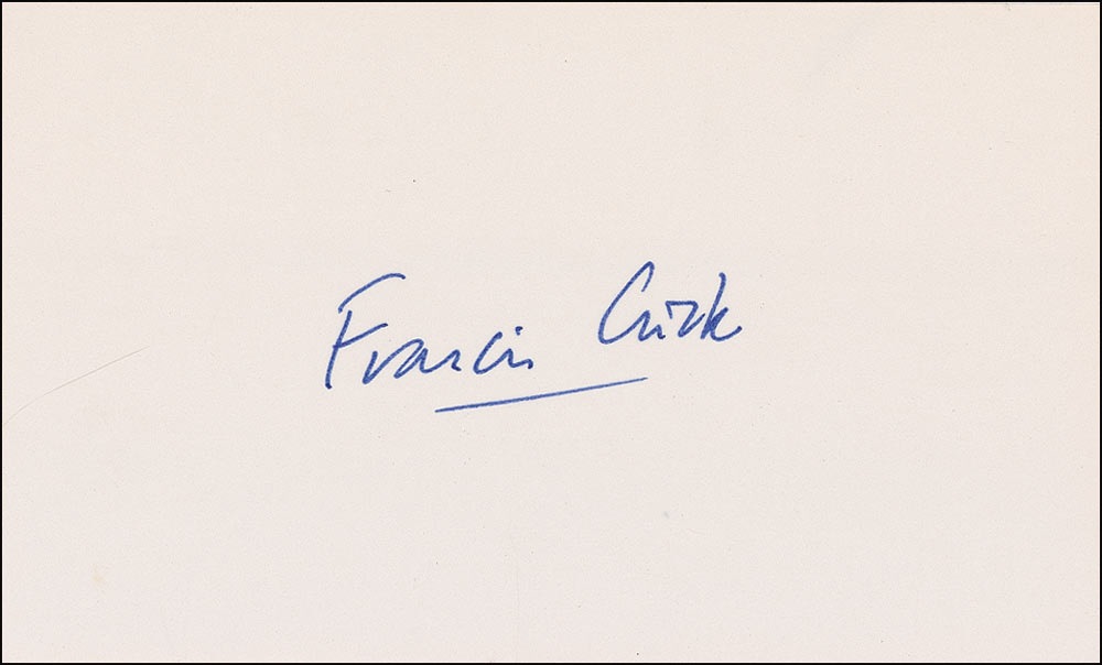 Along with Maurice Wilkins and James D. Watson, Crick shared the 1962 Nobel Prize in Medicine for discovering the function and structure of DNA, providing enormous impetus for research in the emerging fields of molecular genetics and biochemistry. Crisp ink signature, “Francis Crick,” on an off-white 5 x 3 card. In very fine condition. RRAuction COA.