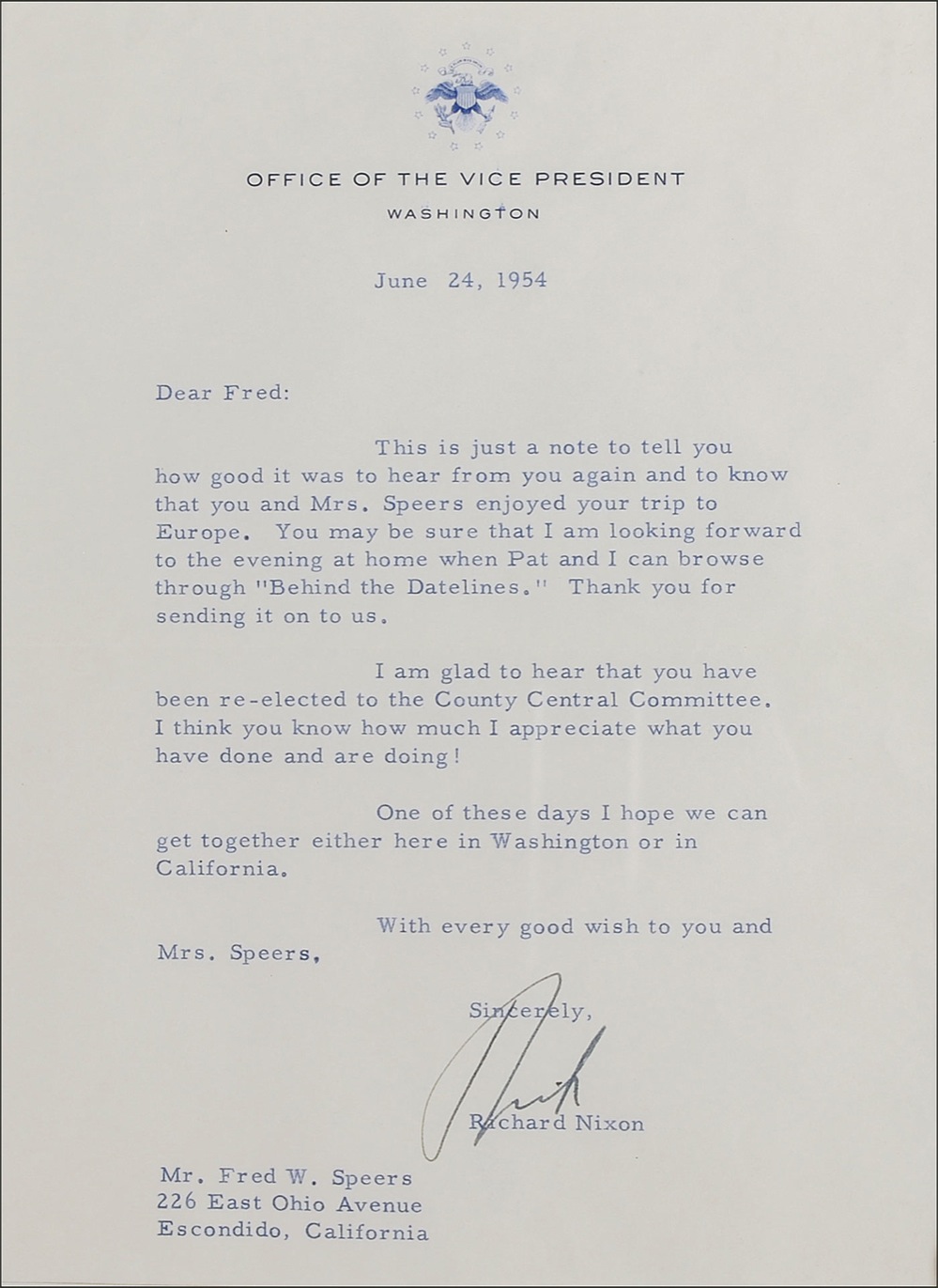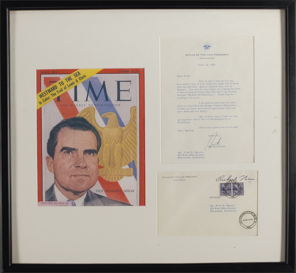 TLS signed “Dick,” one page, 6.5 x 9, Office of the Vice President letterhead, June 24, 1954. Letter to Fred Speers in California. In part: “This is just a note to tell you how good it was to hear from you again and to know that you and Mrs. Speers enjoyed your trip to Europe. You may be sure that I am looking forward to the evening at home when Pat and I can browse through ‘Behind the Datelines.’ Thank you for sending it to us. I am glad to hear that you have been re-elected to the County Central Committee. I think you know how much I appreciate what you have done and are doing!” Matted and framed with the original mailing envelope, bearing a pre-printed franking signature, and a cover from the October 10, 1955, issue of Time magazine, to an overall size of 20.75 x 19.5. In fine condition, with a few light wrinkles. Pre-certified John Reznikoff/PSA/DNA and RRAuction COA.