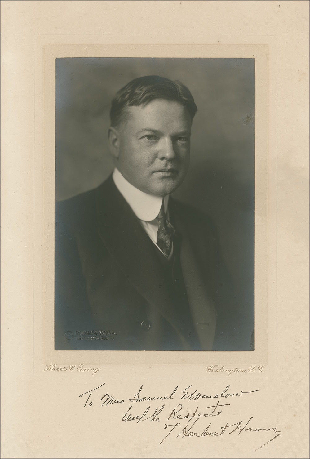 Vintage matte-finish 4.5 x 6.5 Harris and Ewing portrait, affixed to its original 7.25 x 10.5 photographer’s mount, signed and inscribed on the mount in black ink “To Mrs. Samuel E. Winslow, with the respects of Herbert Hoover.” In fine condition, with mild silvering to edges of image, and a bit of light toning to mount. Pre-certified John Reznikoff/PSA/DNA and RRAuction COA.