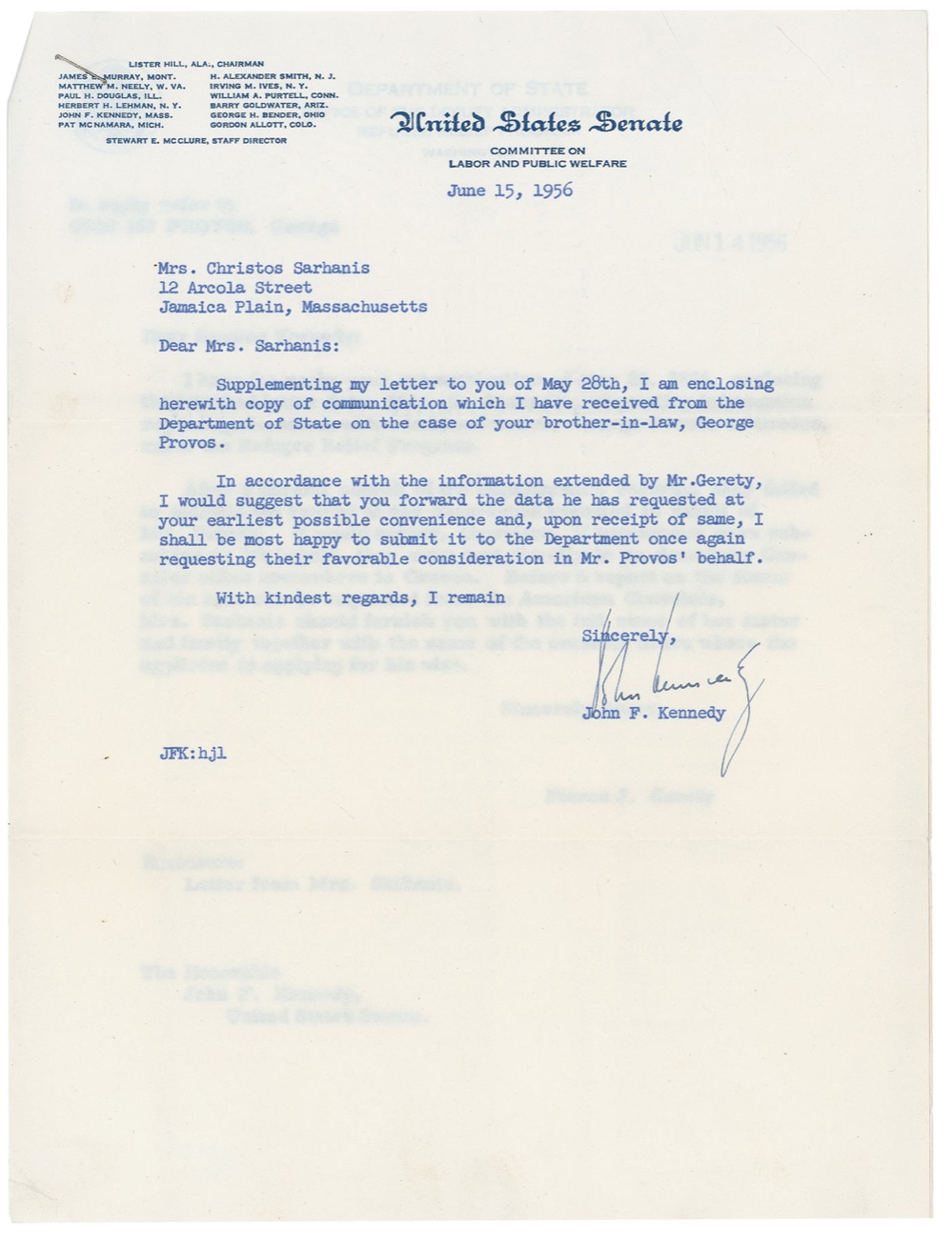 TLS, one page, 8 x 10.25, United States Senate letterhead, June 15, 1956. Letter to a constituent regarding a visa application. In full: “Supplementing my letter to you of May 28th, I am enclosing herewith copy of communication which I have received from the Department of State on the case of your brother-in-law, George Provos. In accordance with the information extended by Mr. Gerety, I would suggest that you forward the data he has requested at your earliest possible convenience and, upon receipt of same, I shall be most happy to submit it to the Department once again requesting their favorable consideration in Mr. Provos’ behalf.” Stapled to Kennedy’s letter is a carbon of Mr. Gerety’s letter to Kennedy regarding the information to be forwarded. Intersecting folds, one through a single letter of signature, scattered creases and wrinkles, and a staple to top left corner, otherwise fine condition. A wonderful example of Kennedy’s genuine concern for his constituents. Pre-certified John Reznikoff/PSA/DNA and RRAuction COA.