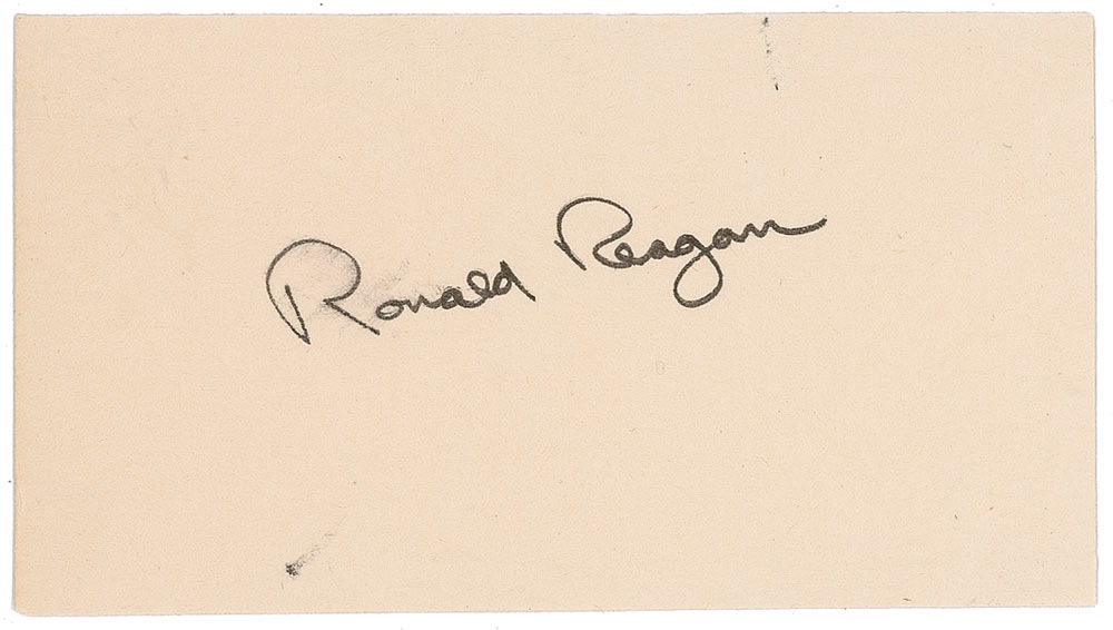 Felt tip signature, “Ronald Reagan,” on an off-white 4.5 x 2.5 card. Fingerprint brush to first name, stray ink mark near bottom, and slight surface loss near top edge, otherwise fine condition. RRAuction COA.