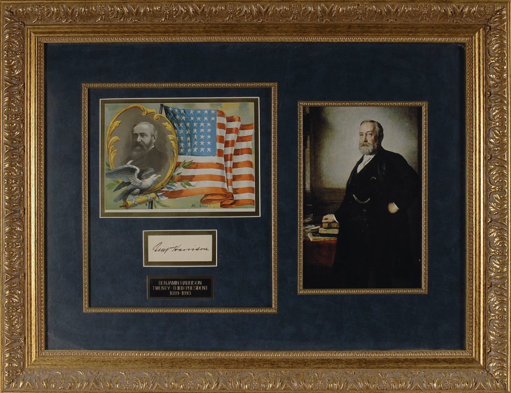 Bold ink signature, “Benj. Harrison,” on an off-white card. Double leather matted and framed with a color portrait of Harrison, a small commemorative print, and a name plaque to an overall size of 27 x 21. In fine condition. Oversized. Pre-certified John Reznikoff/PSA/DNA and RRAuction COA.