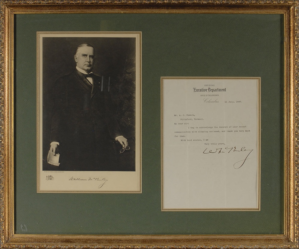 TLS signed “W. McKinley,” one page, 7.5 x 10.25, State of Ohio letterhead, July 11, 1895. Brief letter of thanks. In full: “I beg to acknowledge the receipt of your recent communication with clipping enclosed, and thank you very much for them.” Double matted and framed with a portrait of McKinley (bearing a pre-printed signature), to an overall size of 24 x 20. In fine condition, with intersecting mailing folds, and a few traces of light toning. Pre-certified John Reznikoff/PSA/DNA and RRAuction COA.