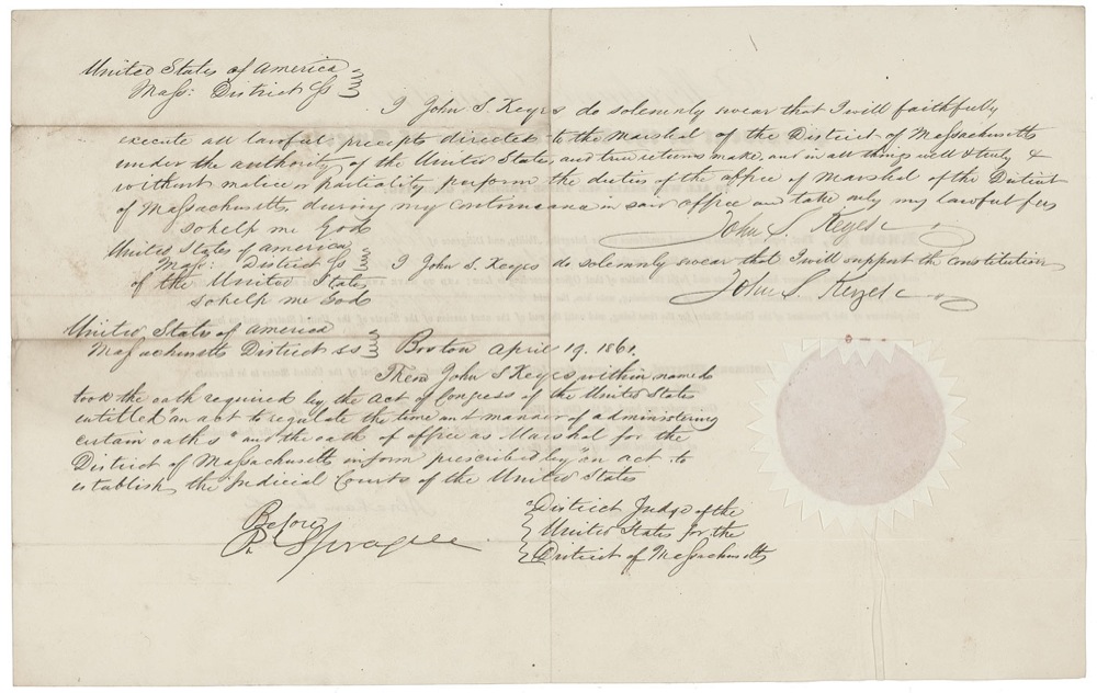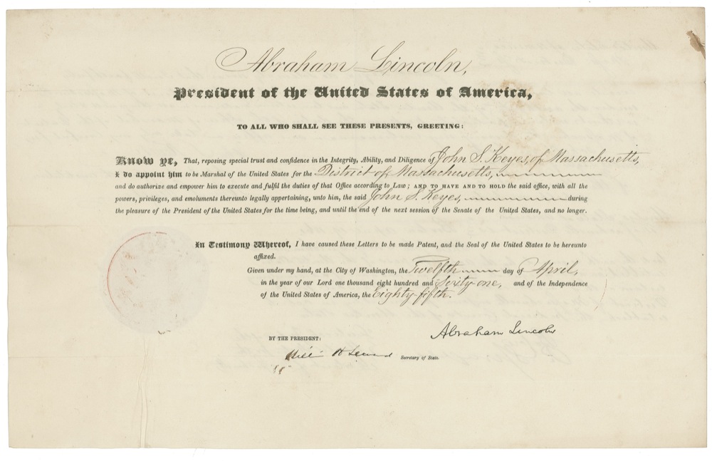 Partly-printed war-dated DS as president, one page, 16 x 10, April 12, 1861. President Lincoln appoints John S. Keyes to be a Marshal of the United States for the District of Massachusetts. Signed at the conclusion in black ink, “Abraham Lincoln,” and countersigned by Secretary of State William Seward. Interestingly, the reverse bears Keyes’s signed oath of office and allegiance to “solemnly swear that I will support the constitution of the United States, so help me God.” Also on the reverse is the April 19, 1861, endorsement from the District Judge of Massachusetts stating Keyes took his oath. In fine condition, with intersecting folds, some scattered light toning, with a few heavier spots near top, mild rippling around seal, light show-through from oath and endorsement on reverse, and a bit of light mirroring of seal.