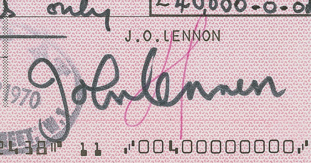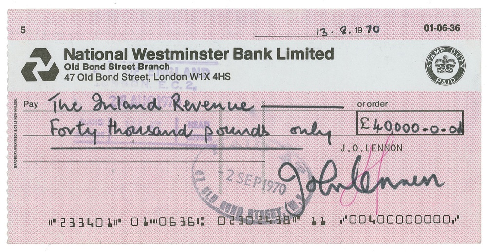 Personal check, 6.25 x 3, filled out and signed by Lennon, payable to The Inland Revenue for £40,000-0-0, August 13, 1970. “J. O. Lennon” is printed on the check above Lennon’s signature [Lennon added ‘Ono’ as a middle name in 1969]. In fine condition, with red ink cancellation through a few letters of signature, and bank stamps to body, with one lightly over the first couple letters of signature.