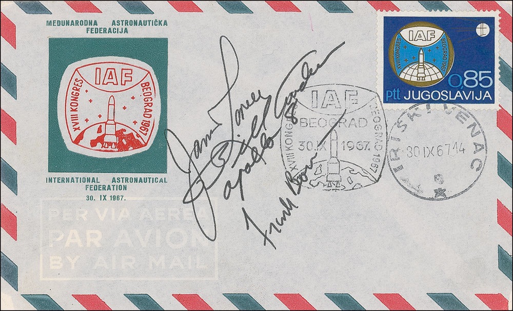 Yugoslavian commemorative cover, 6 x 3.5, with a cachet honoring the International Astronautical Federation, signed in black felt tip by James Lovell, Frank Borman, and Bill Anders, adding “Apollo 8.” In fine condition. Pre-certified Scott Cornish and RRAuction COA.
